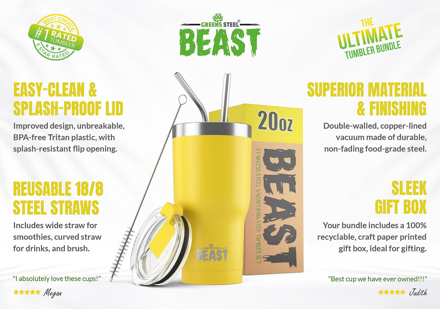 • Q: What is the capacity of the Beast 20 oz Tumbler? A: The Beast tumbler has a capacity of 20 ounces, making it ideal for coffee, iced drinks, shakes, and smoothies.