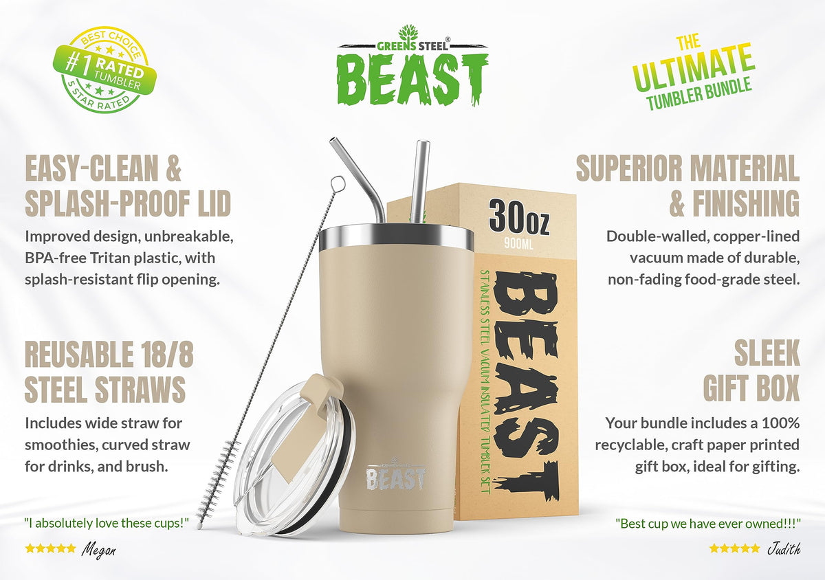- Q: What colors are available for this tumbler? A: The Beast 30 oz Tumbler is available in a stylish sand color, featuring a long-lasting powder coating that resists rust and scratches.
