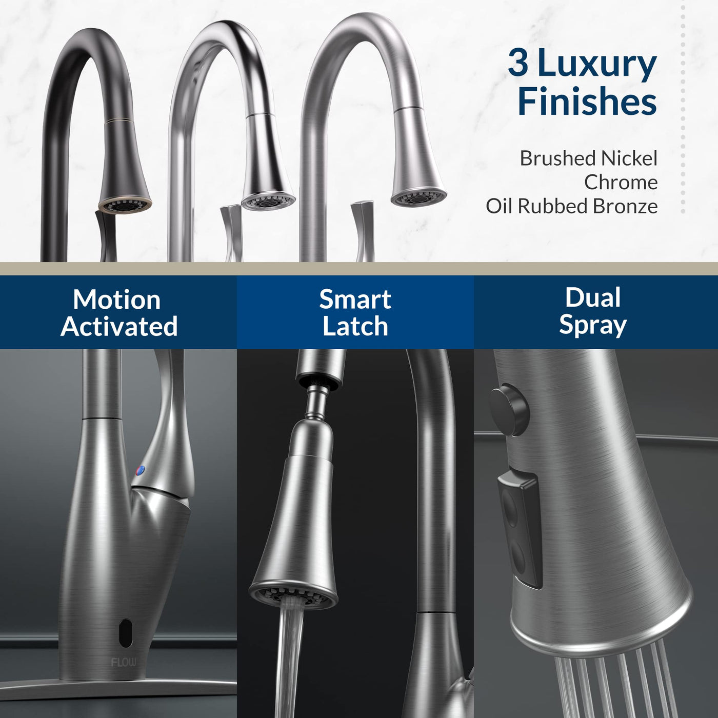 - Q: What are the main features of the Bio Bidet FLOW X Touchless Kitchen Faucet? A: The main features include a hands-free motion sensor for water activation, exclusive SmartLatch technology, a retractable pull-down hose, dual function head with spray and stream patterns, and easy DIY installation.