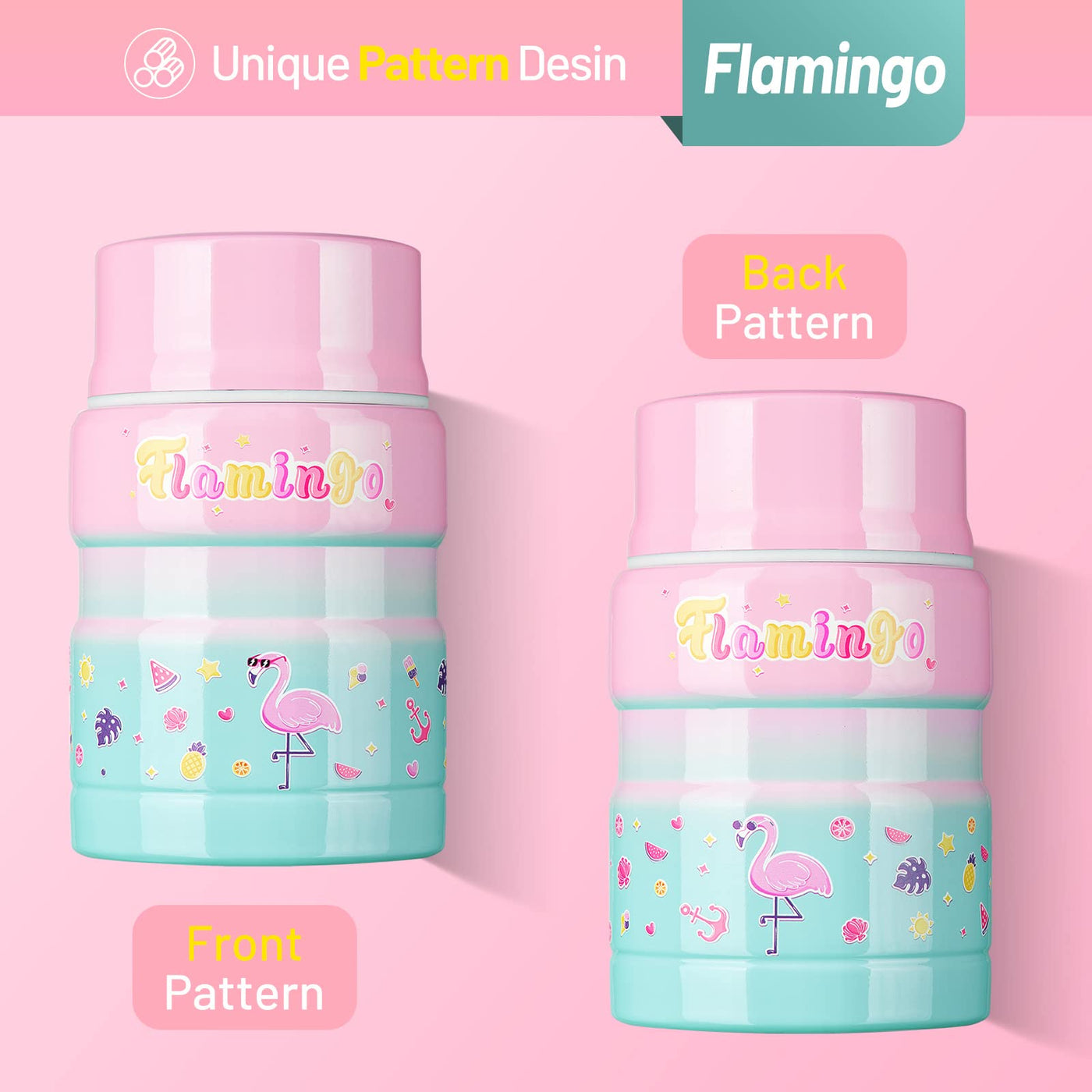 Charcy 17Oz Kids Thermo For Hot Food - Soup Thermo With Folding Spoon - Insulated Food Jar For Hot & Cold Food - Pink Green Flam