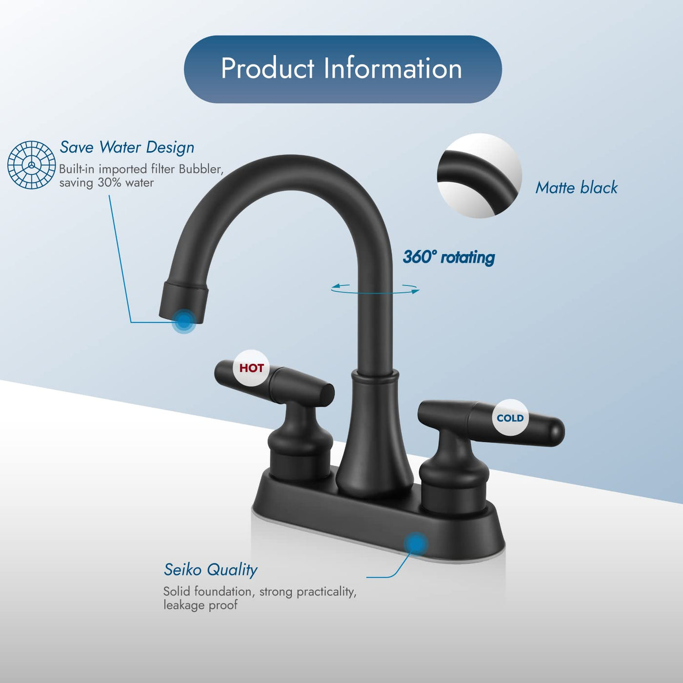 - Q: How does the 360° swivel spout enhance usability? A: The 360° swivel spout offers more clearance and better access to the sink, making it easier to fill larger items and clean the sink.