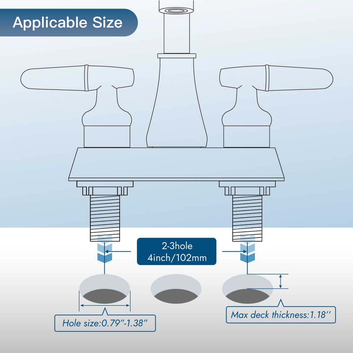 - Q: What are the dimensions required for installation? A: This faucet is designed for sinks with 2 to 3 holes and requires a distance of 4 inches between the holes. The diameter of the hole in the sink should be between 0.79 inches and 1.38 inches.