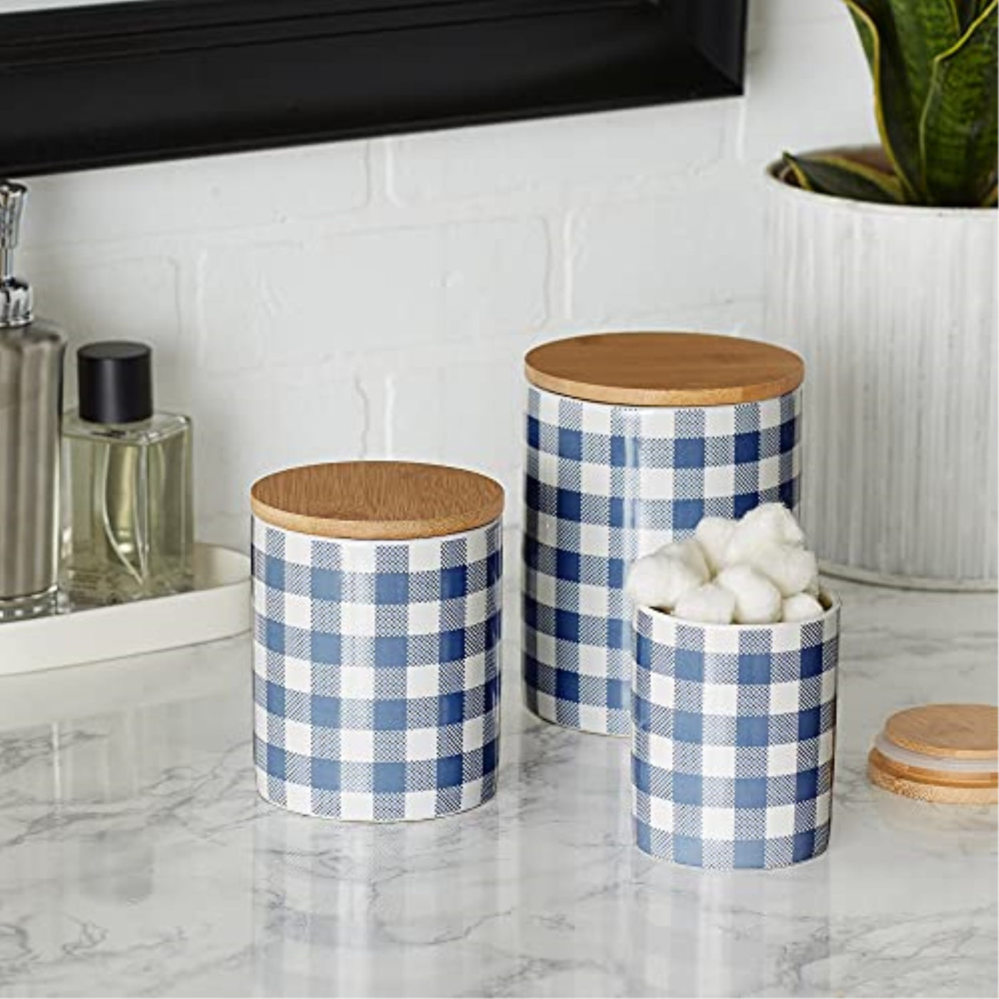 • Q: What is the design style of these canisters? A: The canisters feature a buffalo check design in blue and white, adding a charming touch to country chic or farmhouse decor.