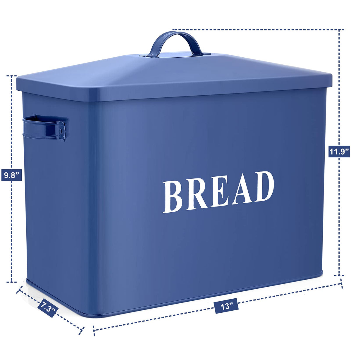 - Q: What are the dimensions of the E-far Navy Blue Bread Box? A: The E-far Navy Blue Bread Box measures 13 inches in length, 9.8 inches in width, and 7.3 inches in height.