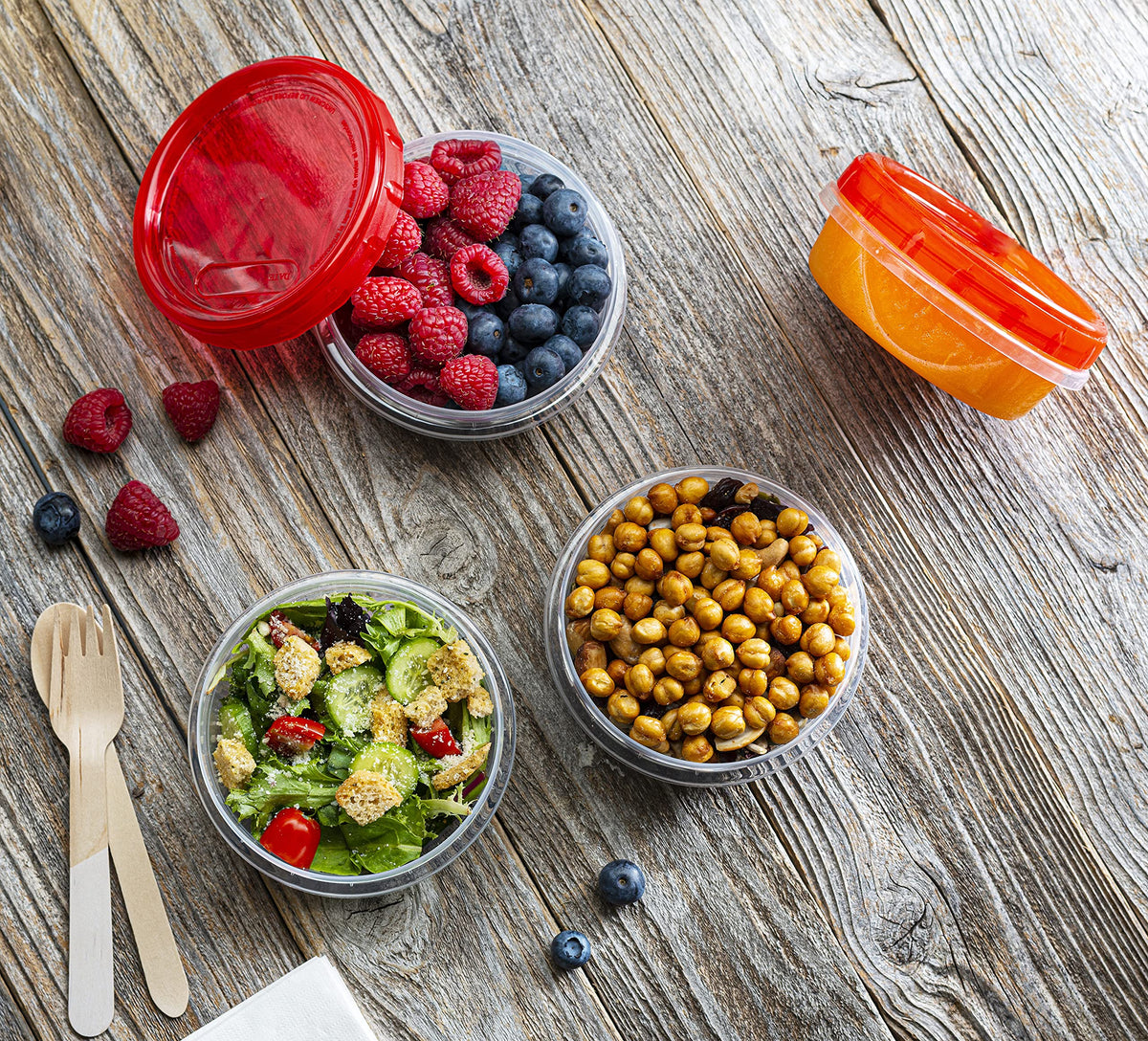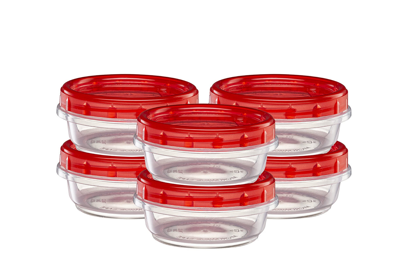 - Q: What are the features of the twist top containers? A: The twist top containers feature a clear bottom, red screw-on lids, and are reusable, stackable, and microwave and dishwasher safe.