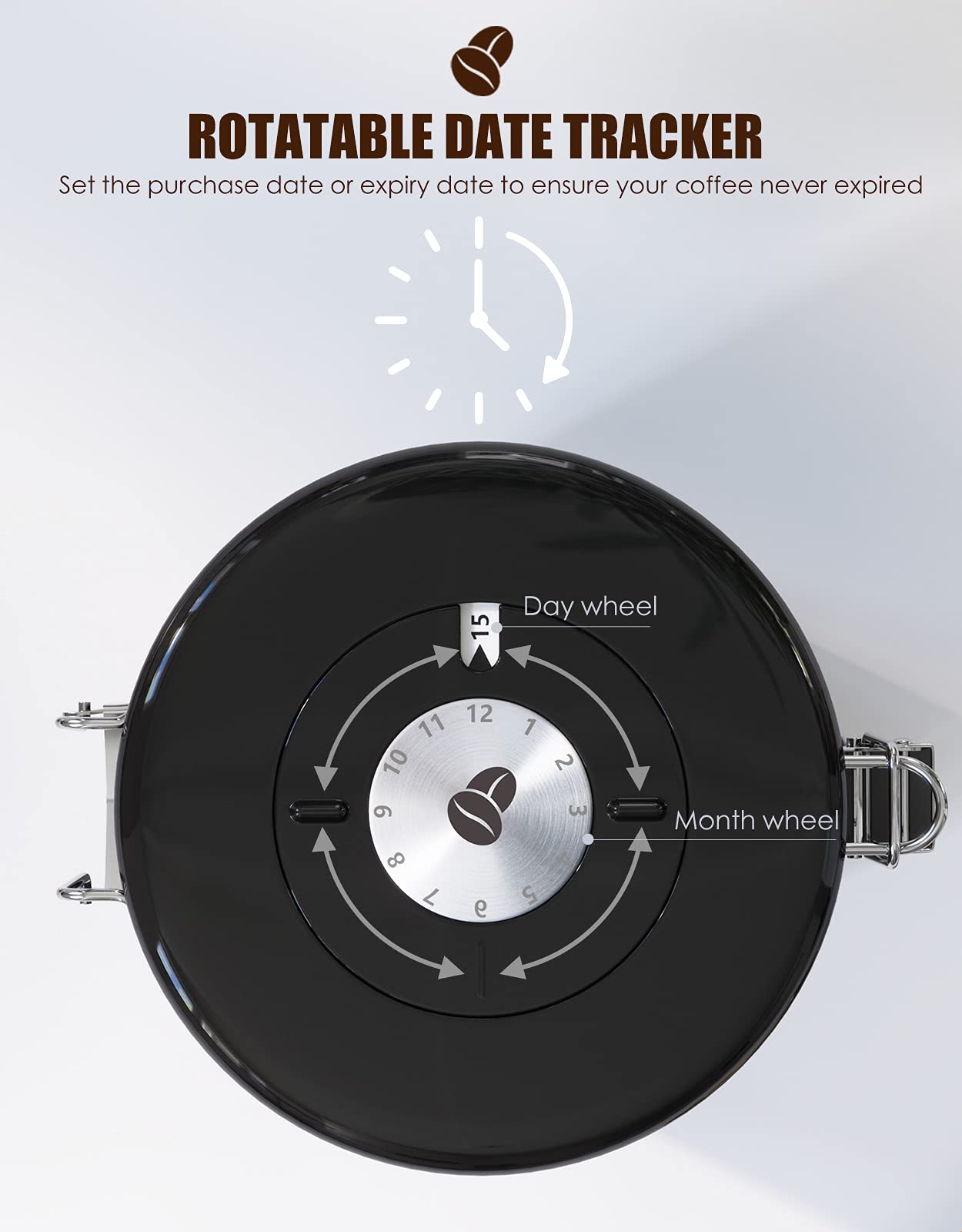 - Q: How do I track the storage date of my coffee? A: The canister features a rotated date tracker (Time Adjustment Dial) on the lid, allowing you to easily set and monitor the storage or expiry date of your coffee.