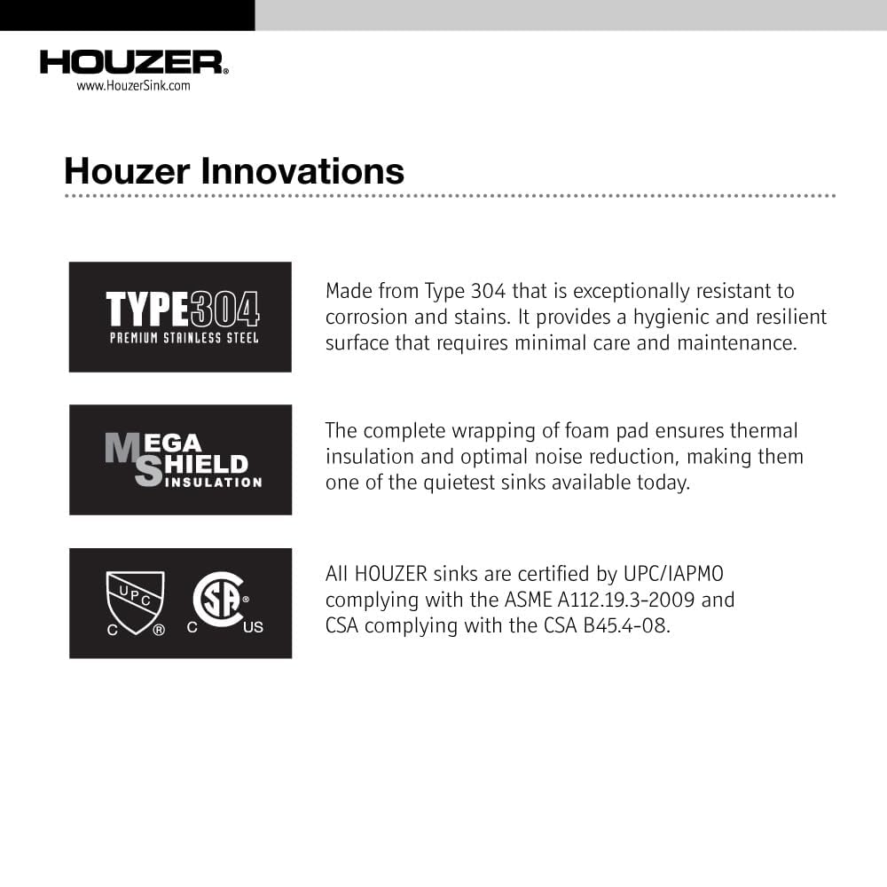 • Q: What features help reduce noise in the Houzer CTB-3285 sink? A: The sink features MegaShield insulation and a patented sound-absorbing pad, which help to minimize noise from clattering dishes and running water.