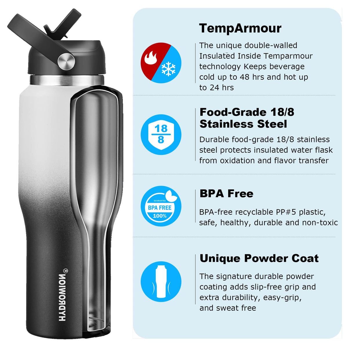 HYDROWION Insulated Water Bottle 32oz Water Bottle with Straw Lid Double Walled Leak Proof 32oz Vacuum Bottle (Cold for 48 Hrs Hot for 24 Hrs) Fit in Any Car Cupholder White&Black