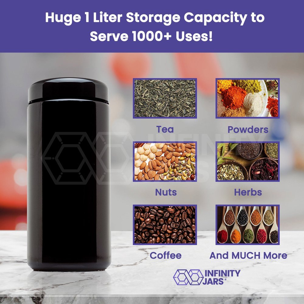 - Q: What types of items can I store in Infinity Jars? A: You can store a variety of items in Infinity Jars, including coffee, tea, spices, dried goods, powder extracts, and beauty products like lotions and balms.