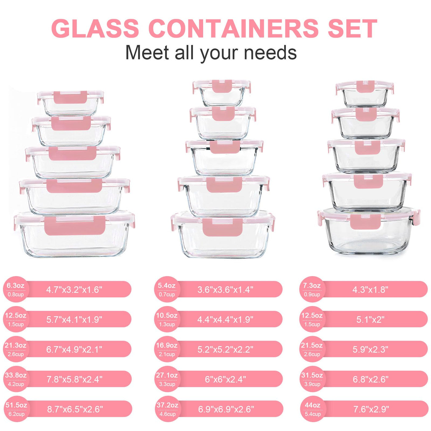 - Q: How many containers are included in the set? A: The set includes 30 pieces: 15 containers and 15 lids in various sizes, including containers ranging from 5.4 ounces to 50.1 ounces.