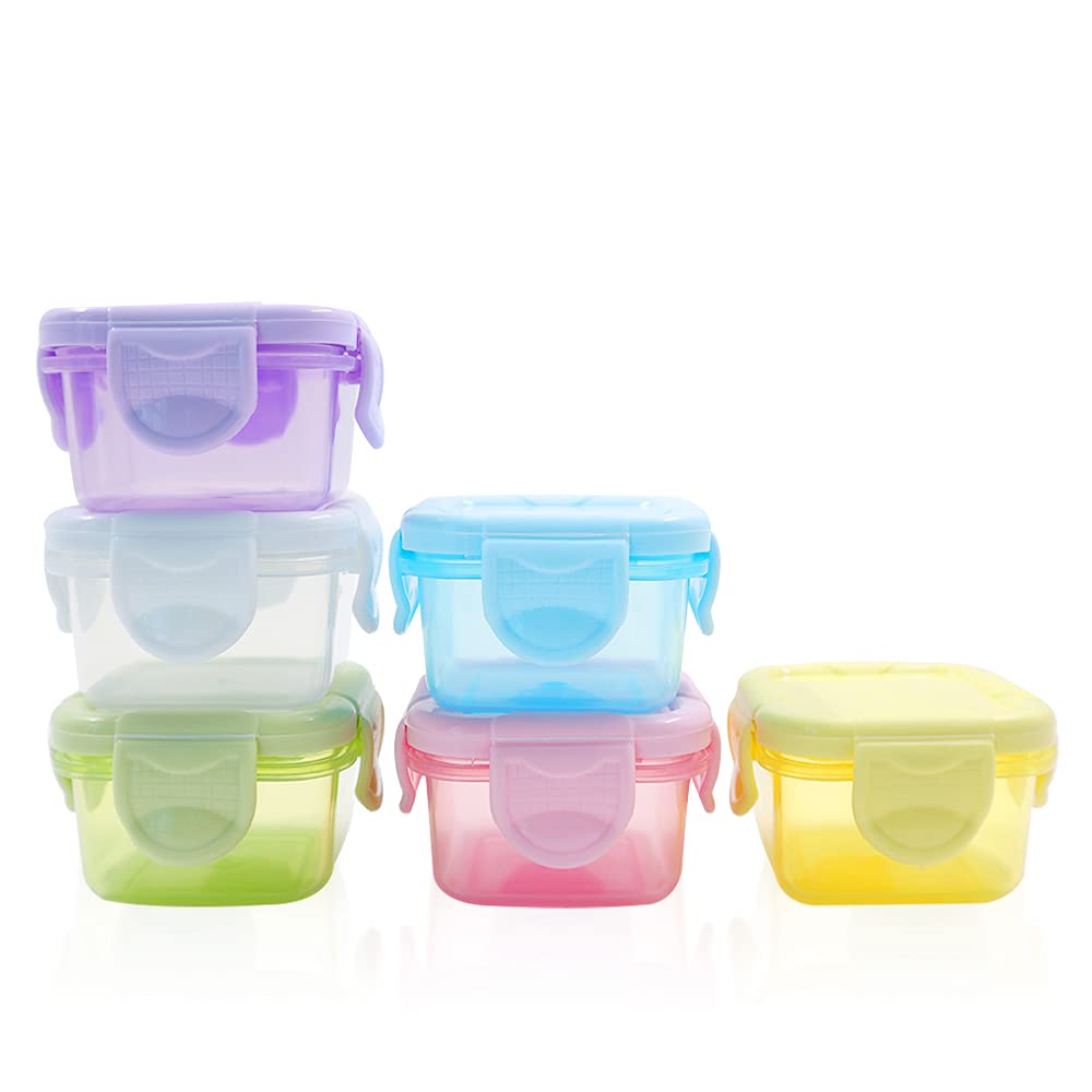 • Q: How many containers come in a set? A: Each set includes 6 mini food storage containers, each in different colors.