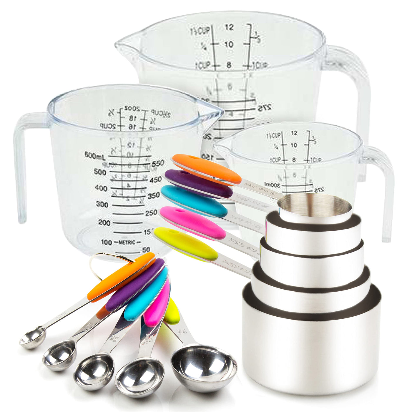 Measuring Cups and Spoons Set 13 Piece. Includes 10 Stainless Steel Measuring Spoons and Cups Set and 3 Plastic Measuring Cup. Liquid Measuring Cups Set and Dry Metal Measuring Cup Set