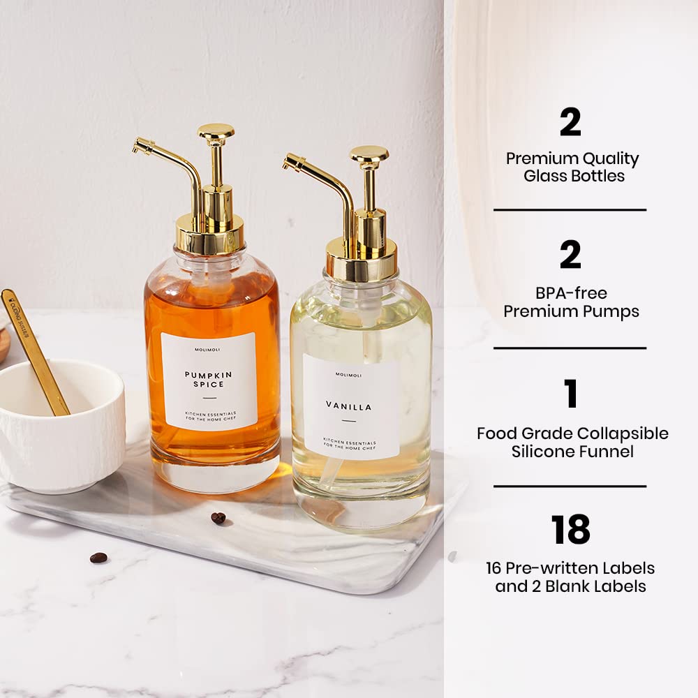 Molimoli Syrup Dispenser For Coffee Bars, Glass Syrup Bottle W. Pump, 16.9 Oz 500 Ml, Set Of 2, Gold Upgraded Dispenser