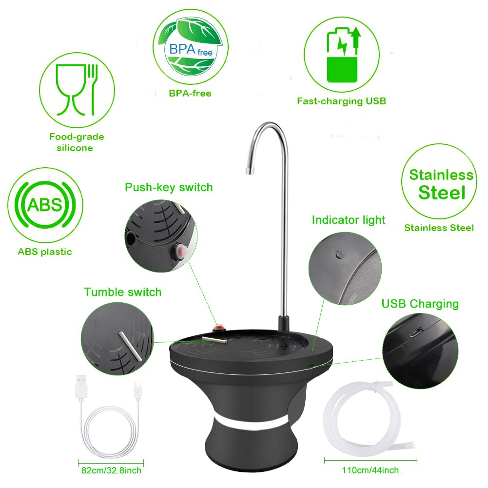 • Q: What are the key features of this water dispenser? A: Key features include being BPA-free, USB rechargeable, compatible with various bottle sizes, easy to use, and suitable for indoor and outdoor settings.