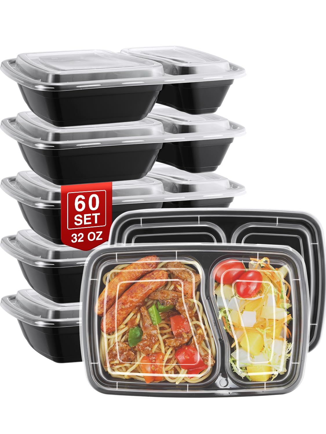 Neebake 60 Sets 32Oz Meal Prep Containers 2 Compartment - Plastic Food Storage Containers 2 Compartments With Lids