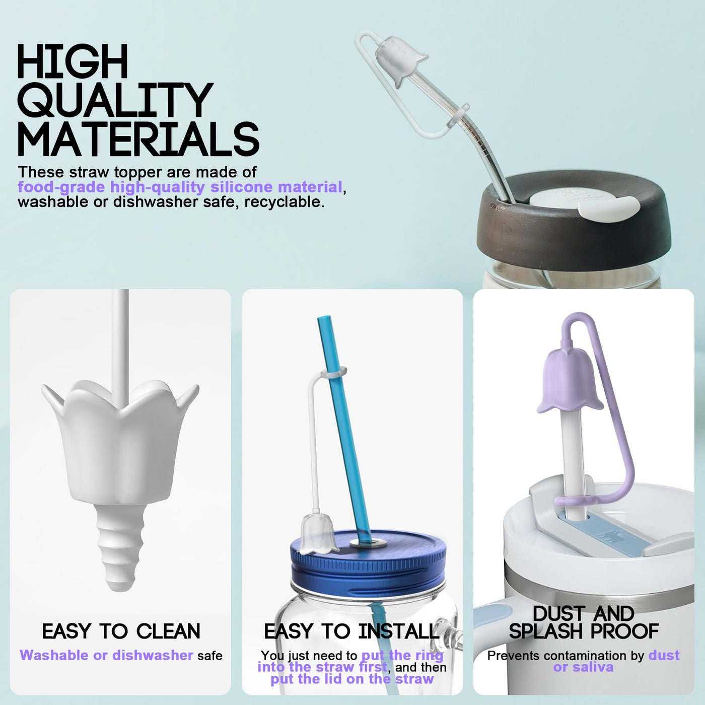 - Q: How do I use the straw covers? A: To use the straw covers, simply place them over the top of the straw. Ensure the petals are reversed for a secure fit to avoid leaks.
