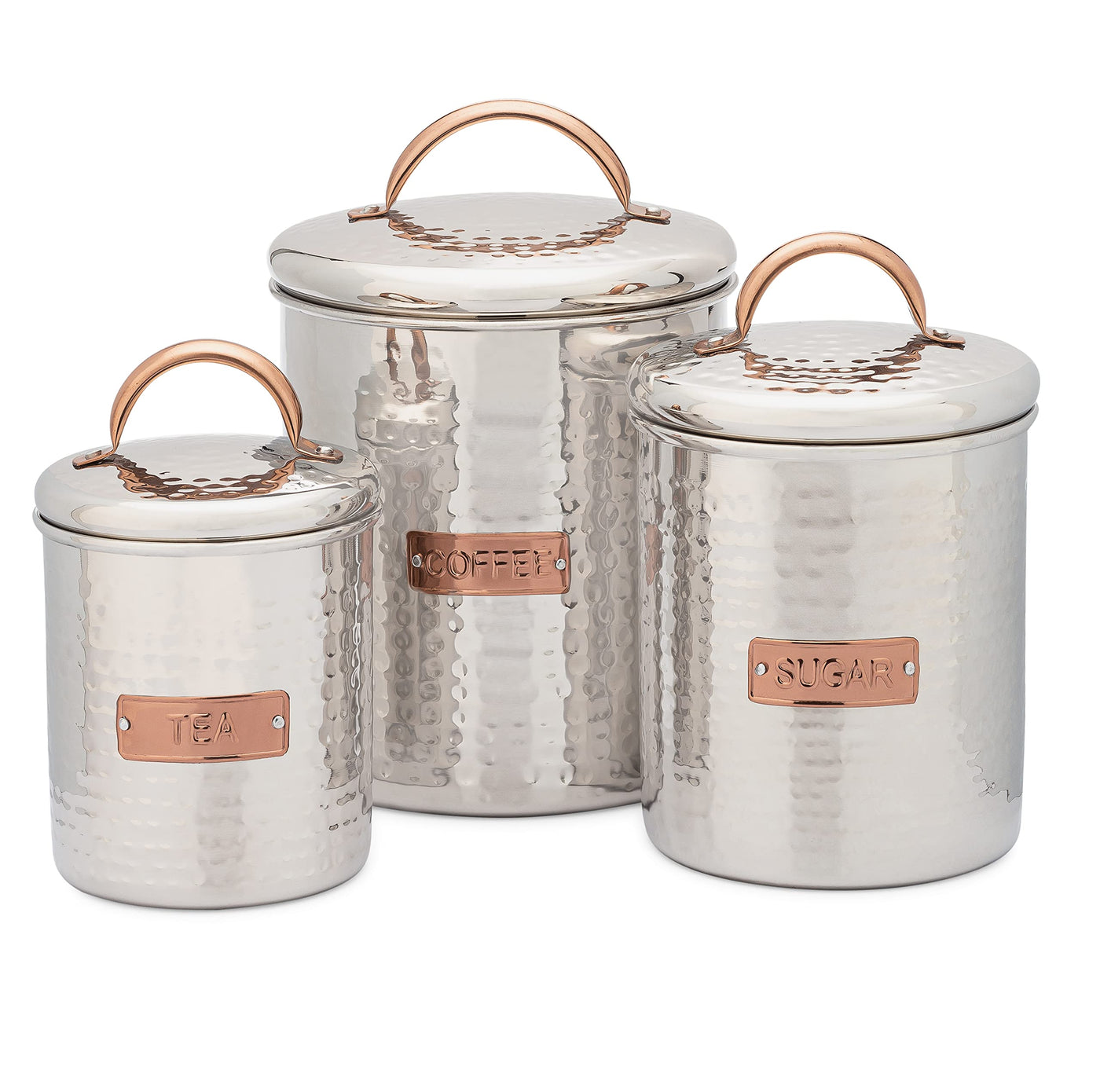 - Q: What is the design style of the canister set? A: The canister set features a trendy design with a shiny hammered finish and copper badge and handle.