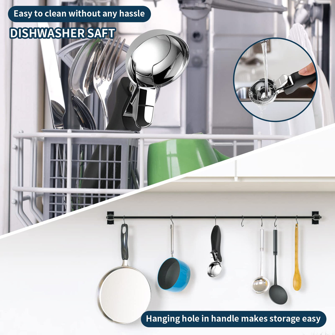 • Q: Is there a way to store the scoop conveniently? A: Yes, the scoop has a hole at the end of the handle, allowing you to hang it up for convenient storage.