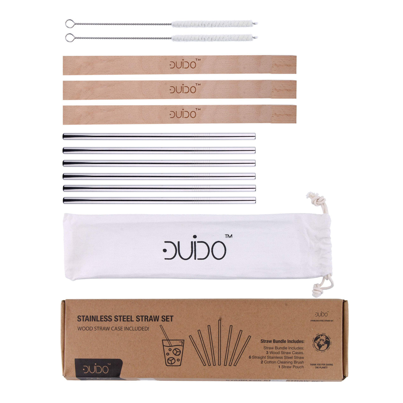 • Q: What is included in the straw set? A: The set includes 6 stainless steel straws, 3 wooden straw cases, 2 cotton cleaning brushes, and 1 storage pouch.