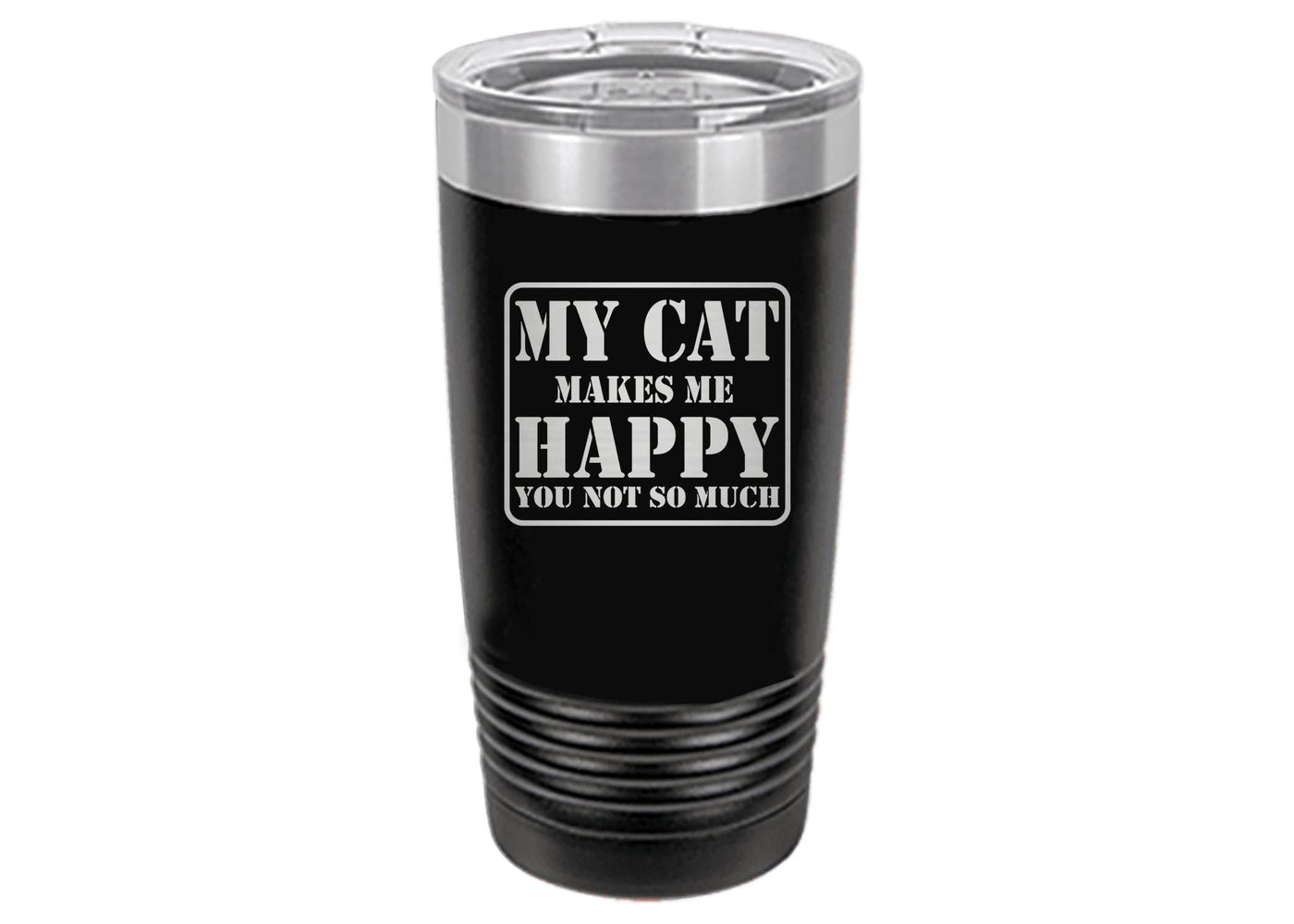• Q: What is the design theme of the tumbler? A: The tumbler features a humorous design that states 'My Cat Makes Me Happy and You Not So Much,' making it a perfect gift for cat lovers.