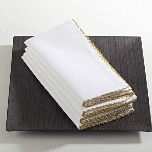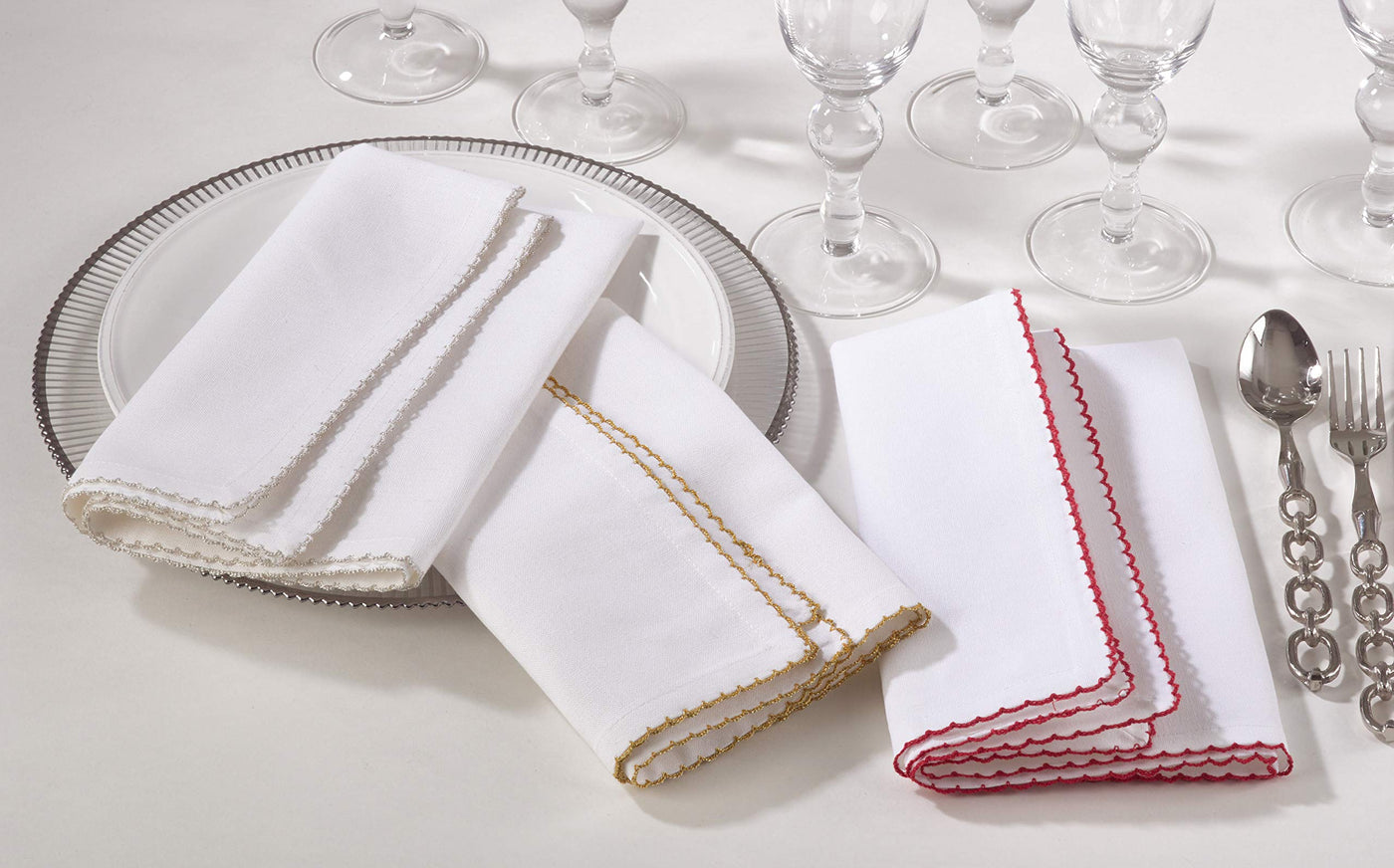 - Q: What is the color of the napkins? A: The napkins are primarily white with a whip stitched border that adds a pop of color.