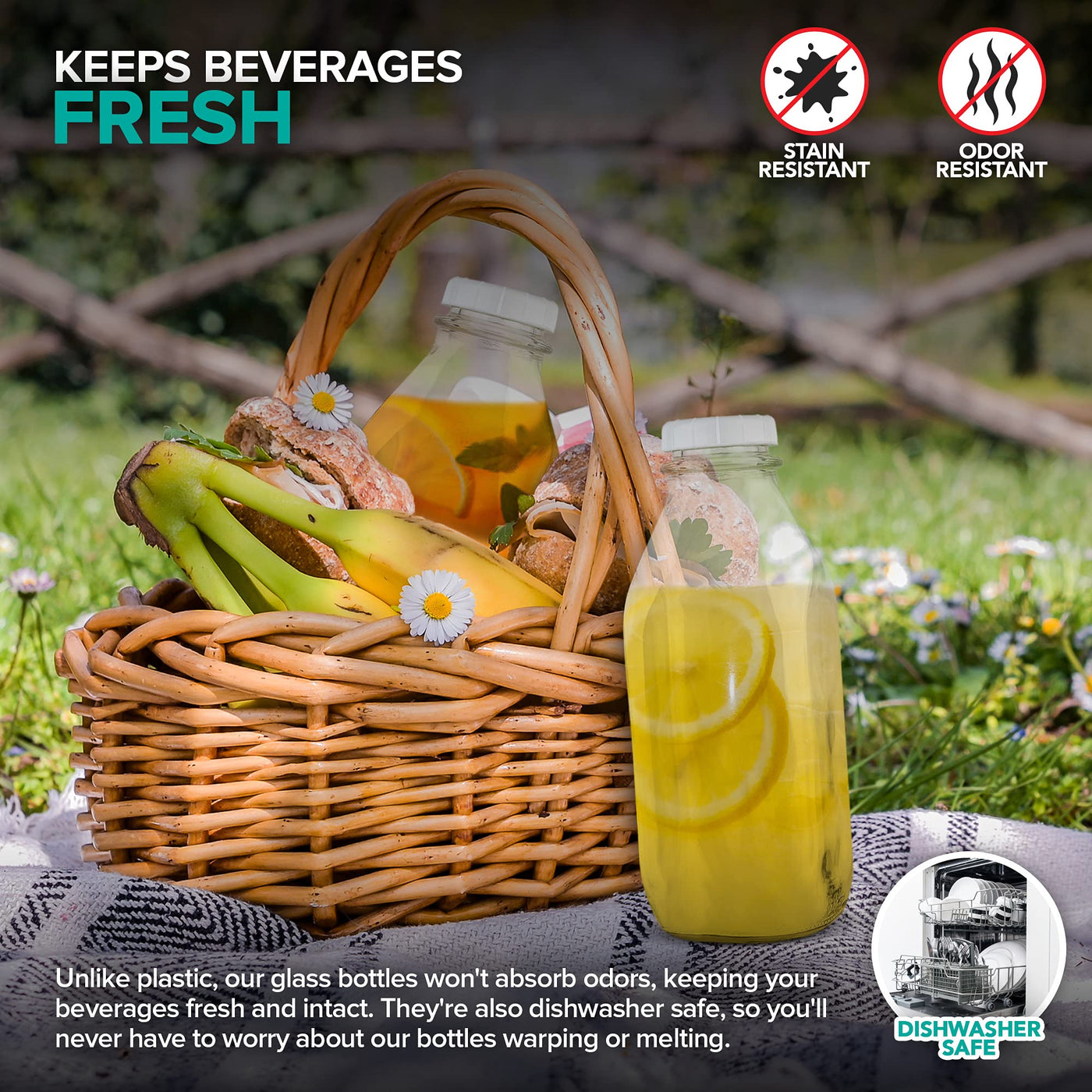 - Q: What makes these glass bottles a better option than plastic? A: These glass bottles are a better option than plastic because they do not warp from heat, are dishwasher safe, and do not leach chemicals into food or liquids.