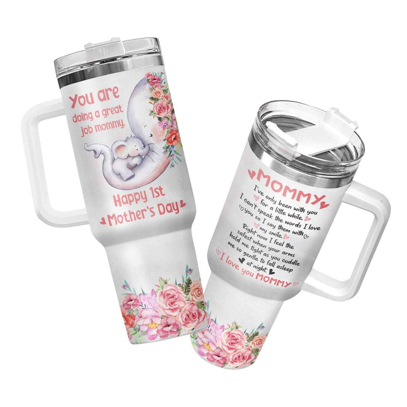 34HD First Mothers Day Gifts, Elephant Mom Tumbler 40oz Stainless Steel with Handle and Straw, Mama Coffee Travel Mug, Cute Baby