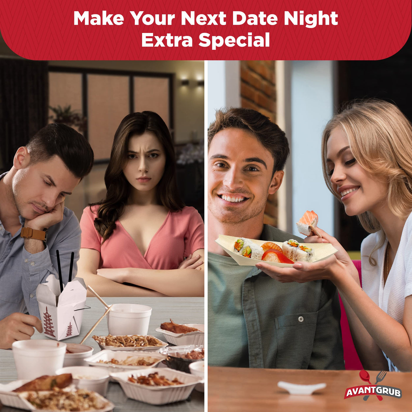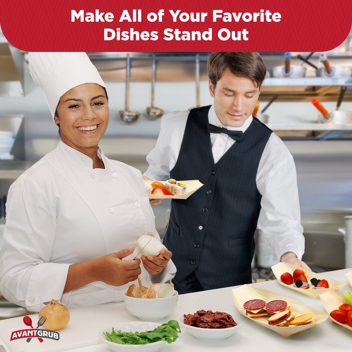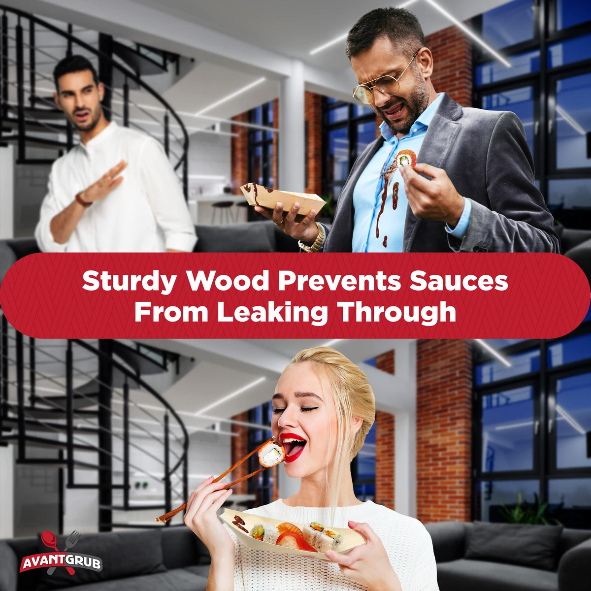 Extra Large 10 in Boats Hold More FoodWhether you're a restaurant owner, home chef, or serving food a festival or church banquet our XL boats are a great serving option. They have a great, unique look and are big enough to hold full meals meaning customer and guests will leave happy.The Perfect Serving PlatterYou can of course use our trays with sushi or sashimi, but the possibilities are limitless. Use them for fruit, desserts, side dishes, popcorn, hot dogs, or sandwiches. The solid poplar base holds up well with thicker sauces, but we recommend doubling up the boats for thin, runny sauces.Machine pressed with no glue or added sealantUnlike many disposable paper and wood products our boats do not have any added filament, tape, glue, etc. The boats are made from beautiful and sturdy poplar to present your food in the best way possible.Eco Friendly and BiodegradableDo you part for the environment by using natural wood products. Avant Grub paper and wood products are designed with the environment in mind and are all properly sourced to make sure we're doing the best we can for Mother Earth.Whats in the box?Your order includes fifty (50) 10 x 5.25 x 1.5 sushi boats.Satisfaction Assured for Life!If you arent completely satisfied with your order, simply email us, and we will respond within 24 hours to make it right even on the weekends. We absolutely assure your satisfaction!