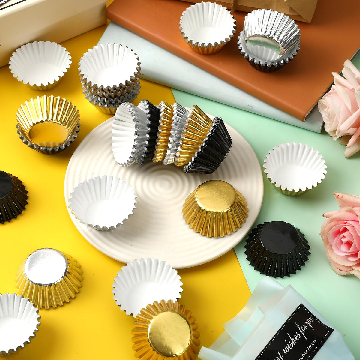 AUGSUN 400pcs Graduation Mini Foil Cupcake Liners Golden Silver Black Cupcake Baking Cups Metallic Mini Muffin Cupcake Wrappers