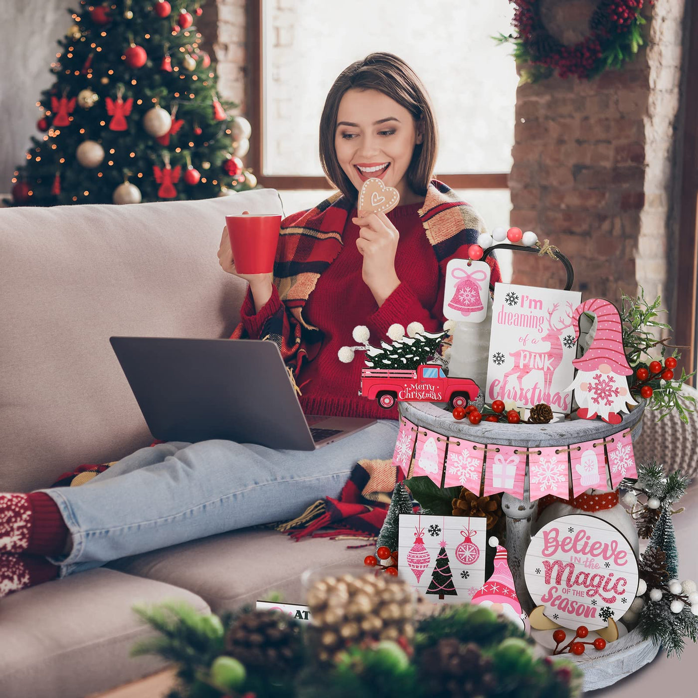 Bucherry 15 Pieces Christmas Tiered Tray Decor Gingerbread Christmas Farmhouse Table Decorations Tiered Tray Xmas Decor Set Wint