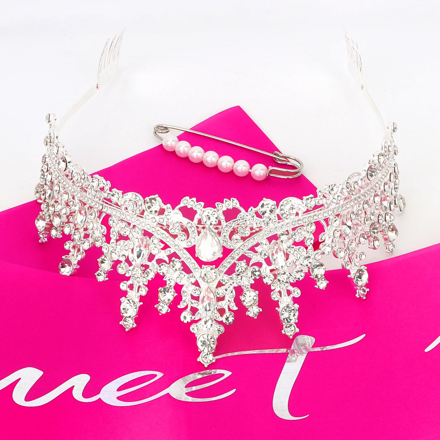 • Q: What is the design feature of the tiara? A: The tiara features rhinestones and is made of alloy, giving it an elegant appearance.