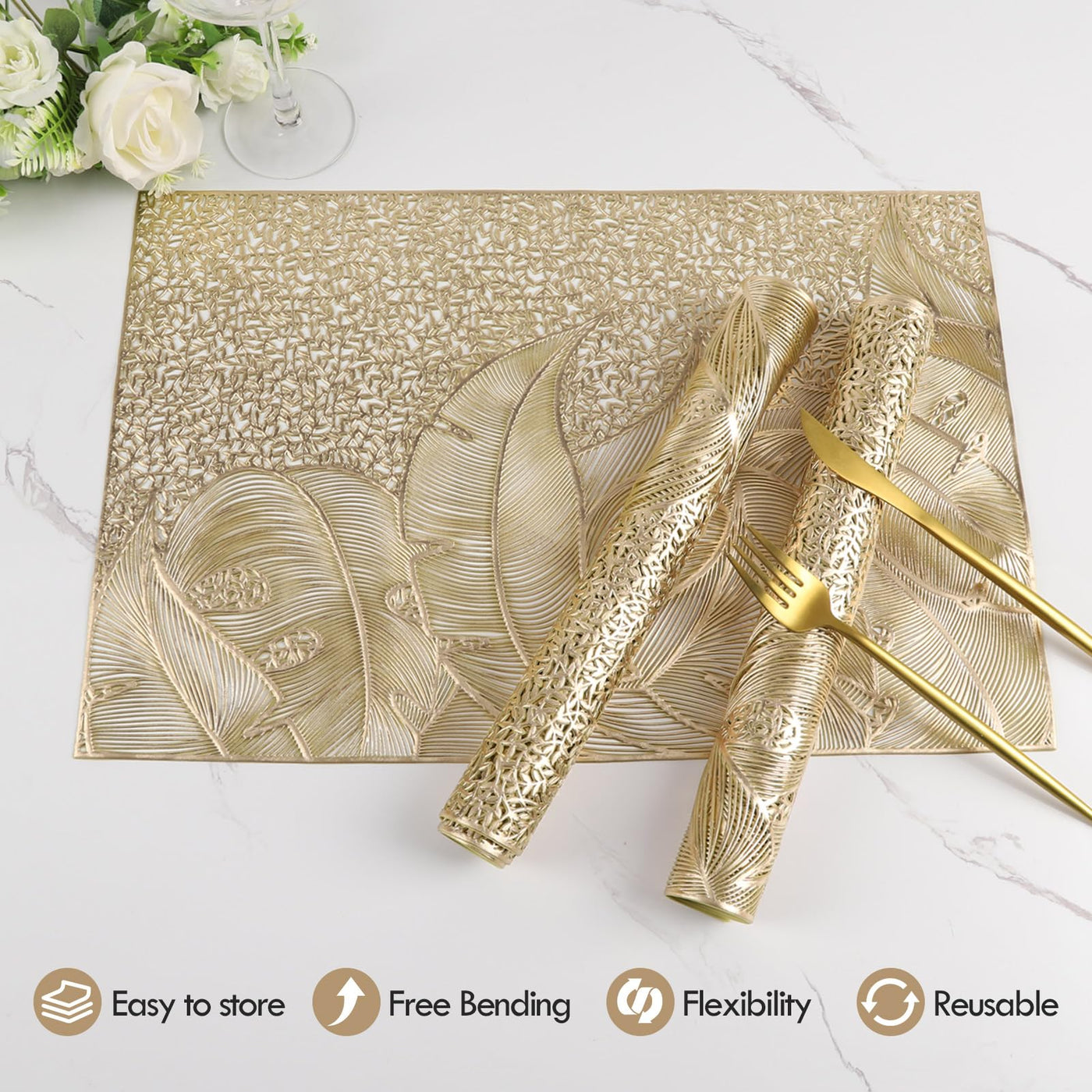 • Q: How do I clean the gold placemats? A: These gold placemats are made of vinyl material and are easy to clean. You can rinse them with water or simply wipe them with a tissue.