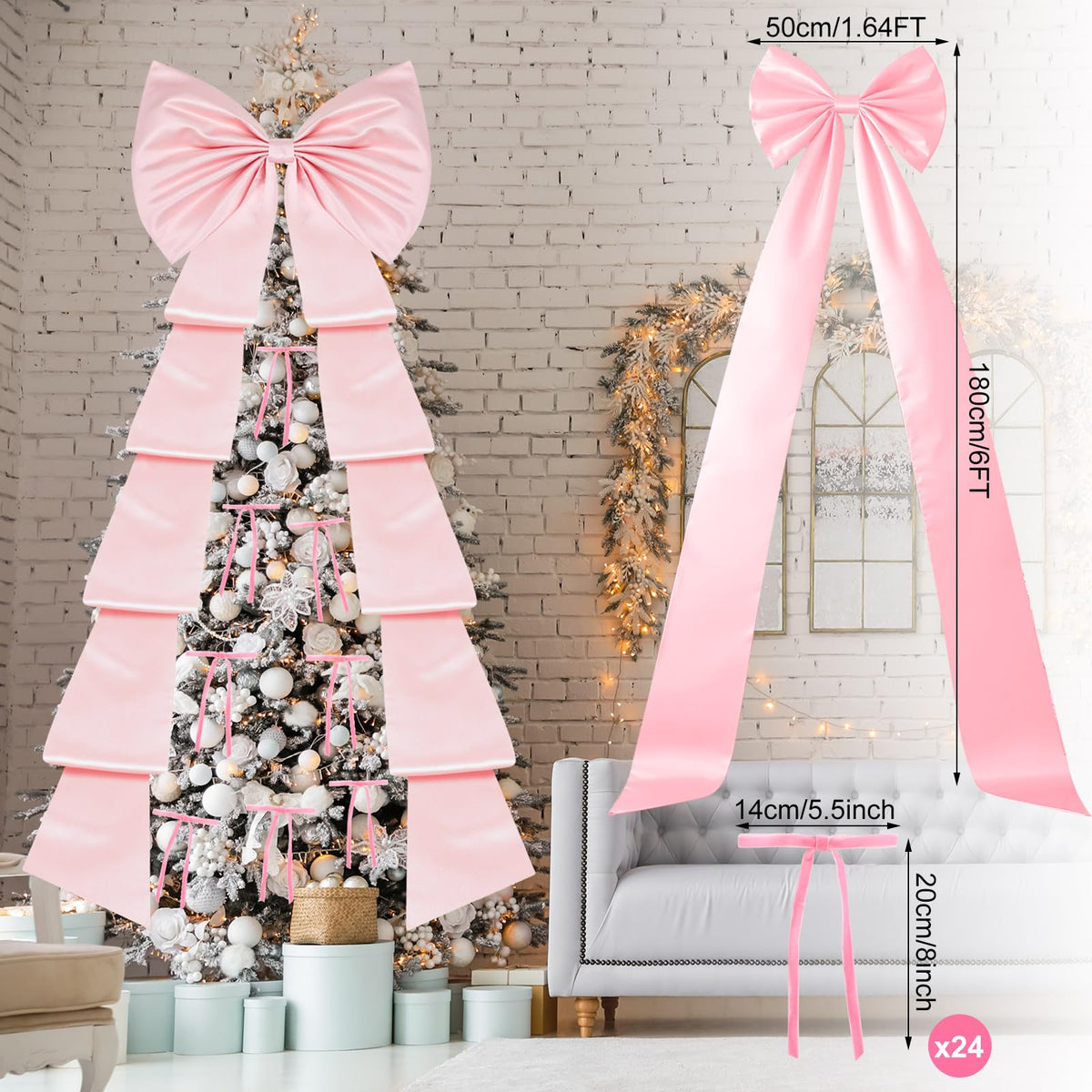 Daifunli 71 x 20 Inch Giant Pink Bow Christmas Tree Topper with 24 Pcs Velvet Christmas Bow Extra Large Xmas Tree Topper Decor f