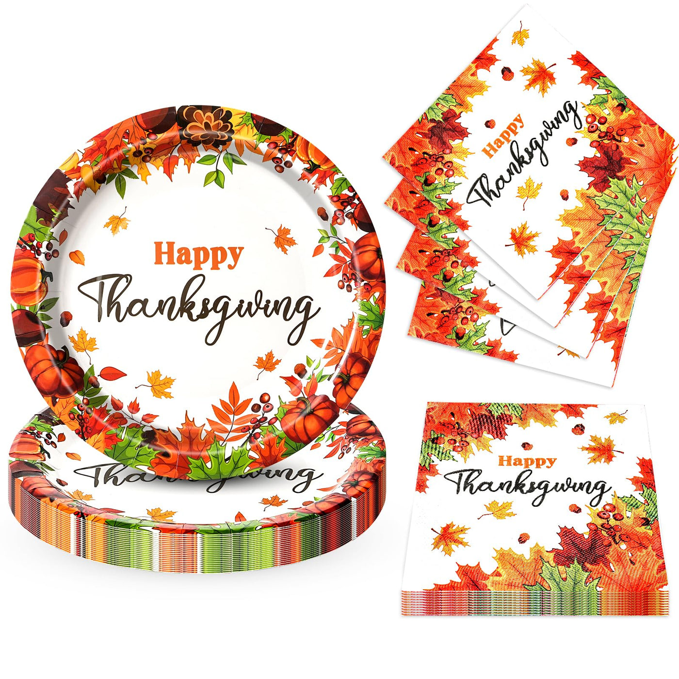 Make your Thanksgiving celebration more festive with this beautiful 50-piece dining set featuring 25 paper plates and 25 matching napkins. The plates measure a generous 9 inches in diameter, perfect for serving holiday meals, while the 6.5-inch napkins provide convenient cleanup. Each piece showcases an elegant autumn-themed design with vibrant orange pumpkins, colorful maple leaves, and decorative fall elements arranged in a wreath-like border around the words Happy Thanksgiving in stylish lettering. The white background makes the warm fall colors pop, creating an eye-catching table setting thats perfect for your holiday gathering. The plates and napkins come in a convenient 50-pack, making it easy to accommodate all your guests while eliminating post-feast dishwashing. These disposable place settings combine practicality with seasonal charm, helping you create a coordinated look for your Thanksgiving table without the hassle of cleanup.