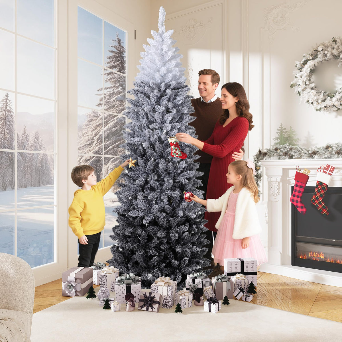 Whimsical Black Gradient Christmas Tree: This pencil Christmas tree features a stunning pink gradient fading from snowy white to soft pink, creating a charming and romantic holiday centerpiece. The flocked branch adds a wintery touch that brightens up any home, office, or party space with elegance | Full & Flexible Flame-Retardant Branch: Crafted with dense, bendable PVC needles, this artificial slim Christmas tree offers lush fullness and easy branch shaping. Its flame-retardant design ensures safety while allowing you to customize the tree's look for a perfect, natural appearance | Easy Setup & Fluffing: Setting up this pink flocked pencil Christmas tree is simple-just connect the sturdy metal base, stack the tree sections, and fluff the hinged branch. Designed for hassle-free holiday decorating, it saves time and effort while delivering a full, festive look | Stable & Floor-Friendly Base: Equipped with a robust X-shaped metal stand, this skinny Christmas tree remains stable without scratching your floors. Its sturdy construction ensures your tree stays upright and secure throughout your holiday celebrations | Slim, Space-Saving Holiday Decoration: The slender design of this snow flocked Christmas tree makes it ideal for narrow corners, apartments, or offices where space is limited. Enjoy festive holiday cheer and stylish Christmas decorations without sacrificing valuable room