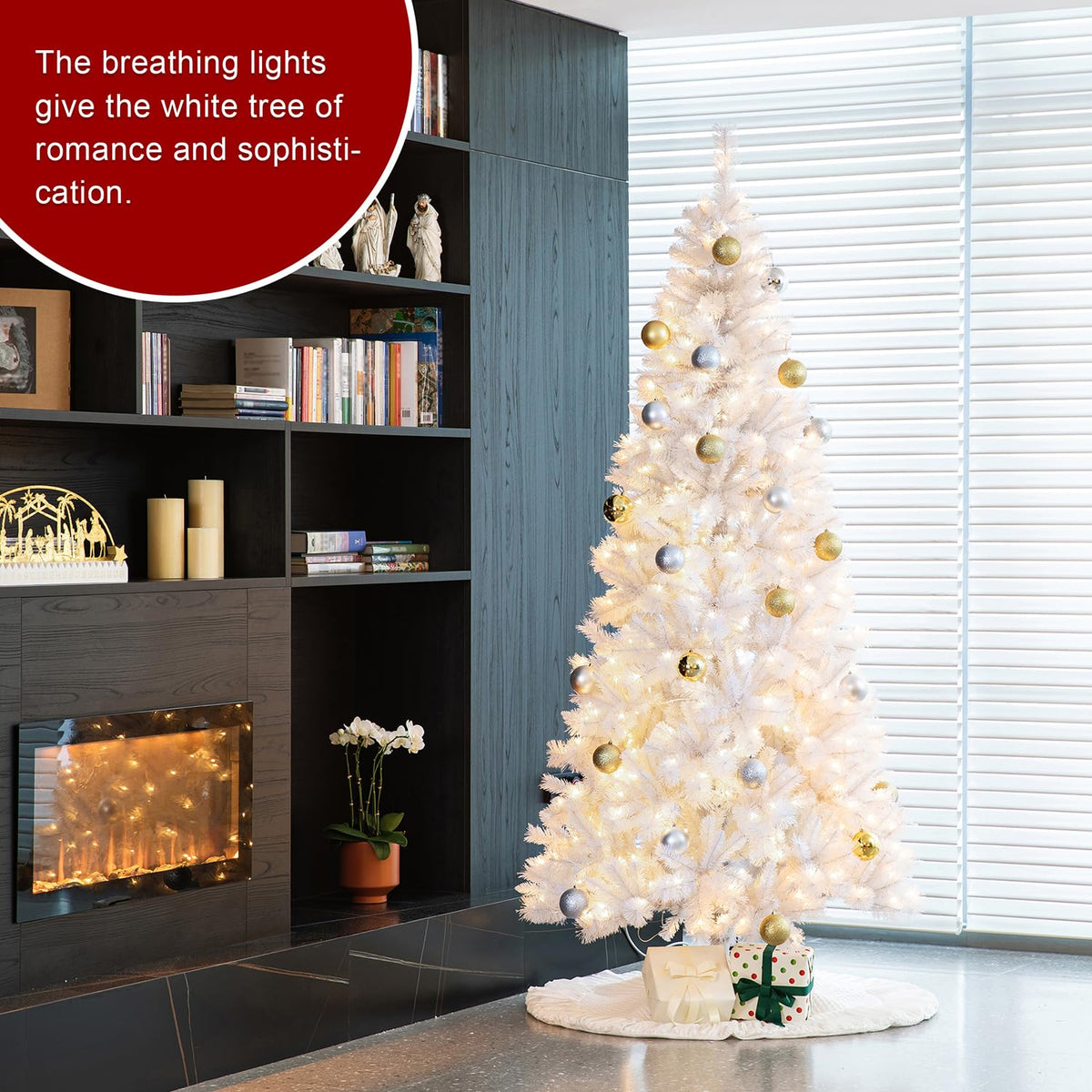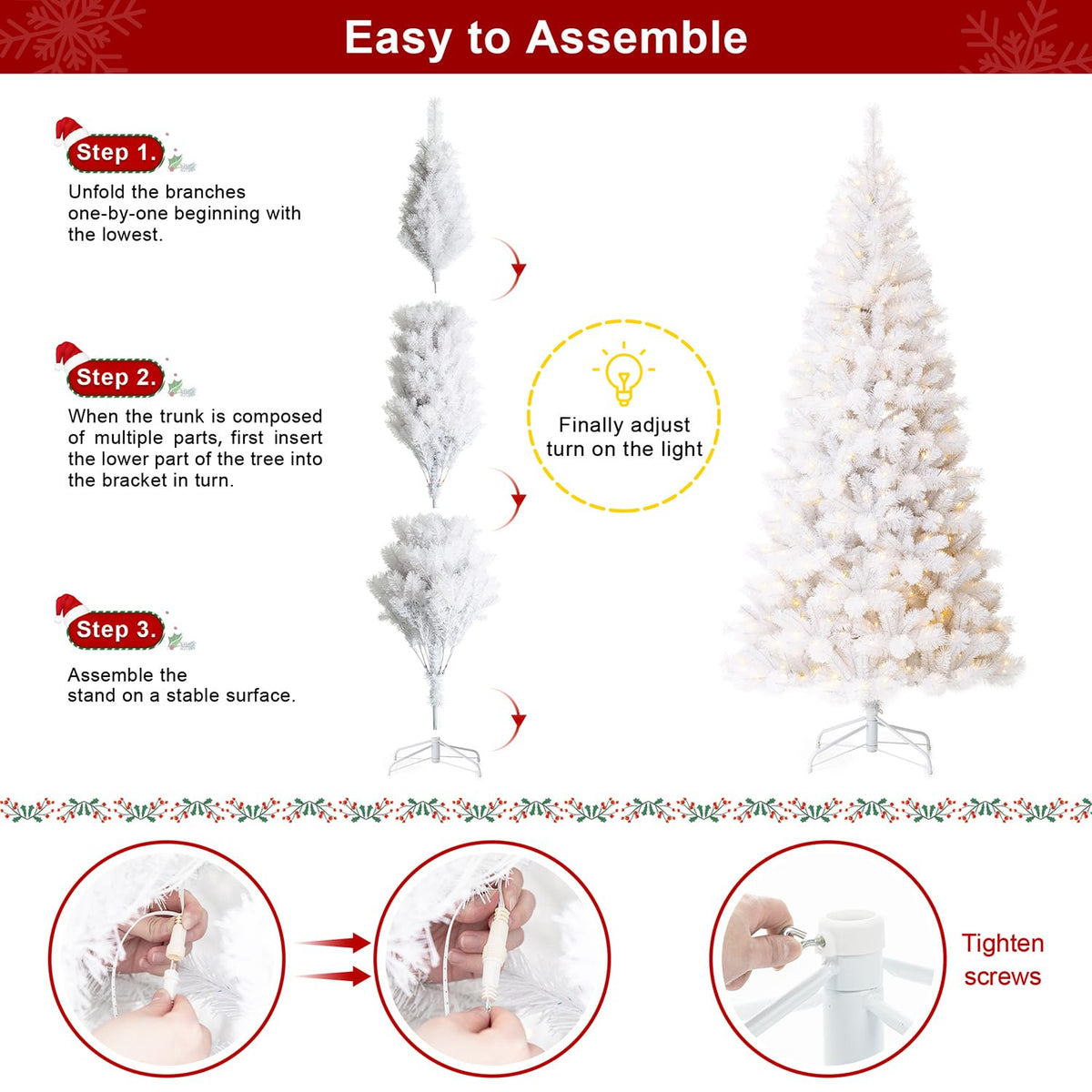 Specifications: Tree: PVC,Metal Stand: 100% metal Tree type: White Pine Size: 40.75 x 40.75 x 96 inches Tips count: 239 Pine needle,854 PVC tips Light count: pre-lit 500 warm white LED light bulbs Unique and realistic, fits beautifully in Modern space Natural appearance look realistic,elegant slim pine without taking much space Hinged construction, its flexible branches are easy to shape Created in mix of four different pine branches with rhythmic arrangement Features: 1. This 8ft Pre-Lit White Pine Slim Artificial Christmas Tree create a unique wintery feel, it will be an eye-catching addition to any room during the Christmas holidays. 2. Glitzhome Christmas trees use sturdy metal stand, built to endure many holidays, provide strong support for the tree and ensure stability, serve you for a long time. 3. A decorator's delight, thanks to open branches and natural pockets designed to showcase your treasured ornaments. This lifelike Pine gleams with 500 warm white microlight LEDs. Package includes: 1 x 8ft Pre-Lit White Pine Slim Artificial Christmas Tree with 500 Warm White Lights