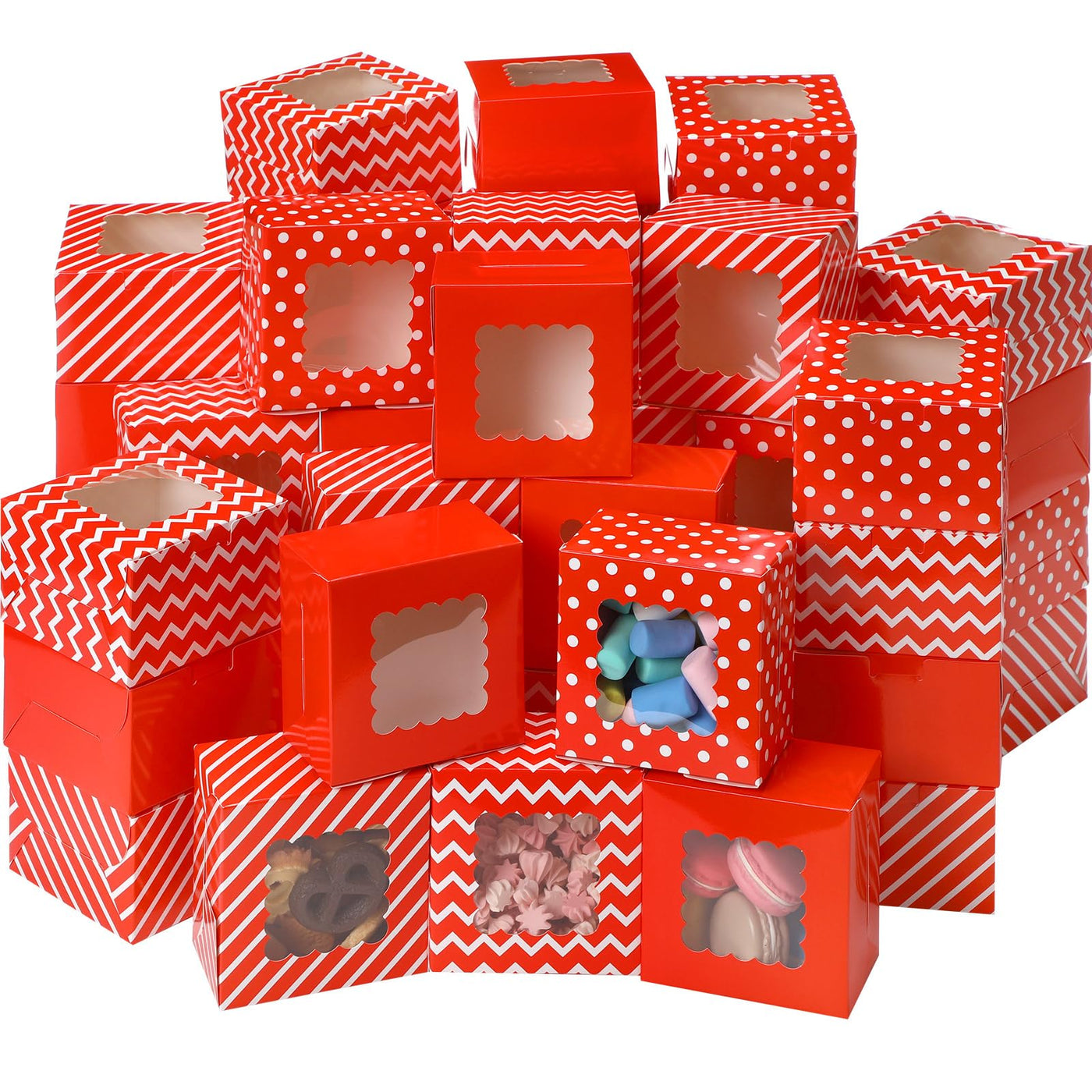 Humyoun 100 Pcs Christmas Cookie Boxes for Gift Giving 4 x 4 x 2.5 Inch Small Red and White Bakery Treat Boxes with Window for X