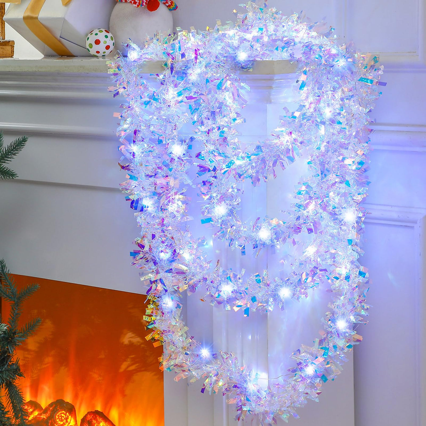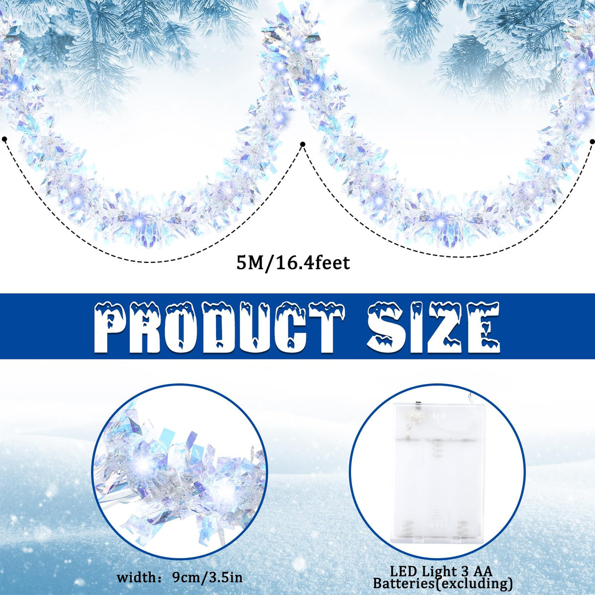 Features: Brighten up the area: The Christmas garland with lights can be applied for school carnival, classroom, stores, office, hallway and any place you want to decorate, vibrant colors and shiny appearance will brighten up the area and bring people a happy mood, equipped string lights make these tinsel garlands more attractive in the dark, ideal additions to liven up the atmosphere. Nice gifts: These Christmas metallic garlands are suitable for sending to your friends, colleagues, relatives, neighbors, family members and others you care and love, they will be happy to receive these gifts. Specifications: Material for garland: plastic Color: Iridescent white Size for garland: 5 m/ 16.4 ft in length, 9 cm/ 3.5 inches in width Package includes: 1 x Christmas tinsel garland 1 x LED string light Notes: Manual measurement, please allow slight errors on size. The color may exist a slight difference due to different screen displays. Winding risk exists, please keep away from little kids.