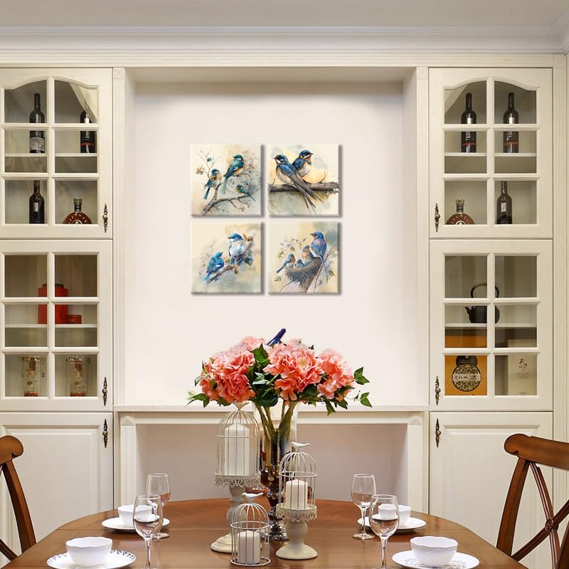 Lasdel Blue Bird Stretched Canvas Wall Art For Bathoom Bedroom Home Decoration, Beautiful Lively Animal Family Picture Print Art