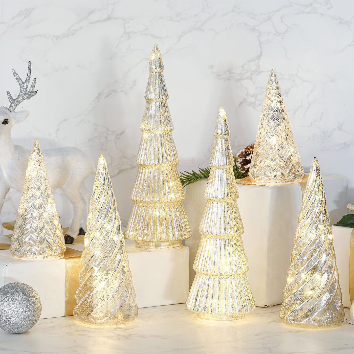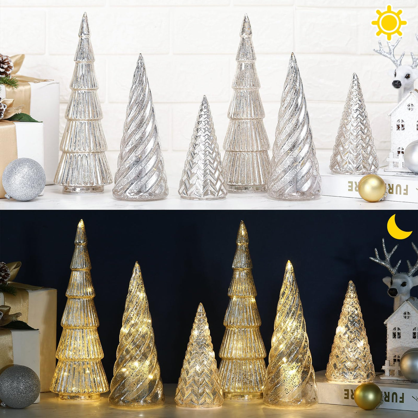 LOYIM 6 Pcs Mercury Glass Christmas Tree Silver Plate Glass Figurines with LED Fairy Lights 11 in Tall Silver Finish Light up Ch