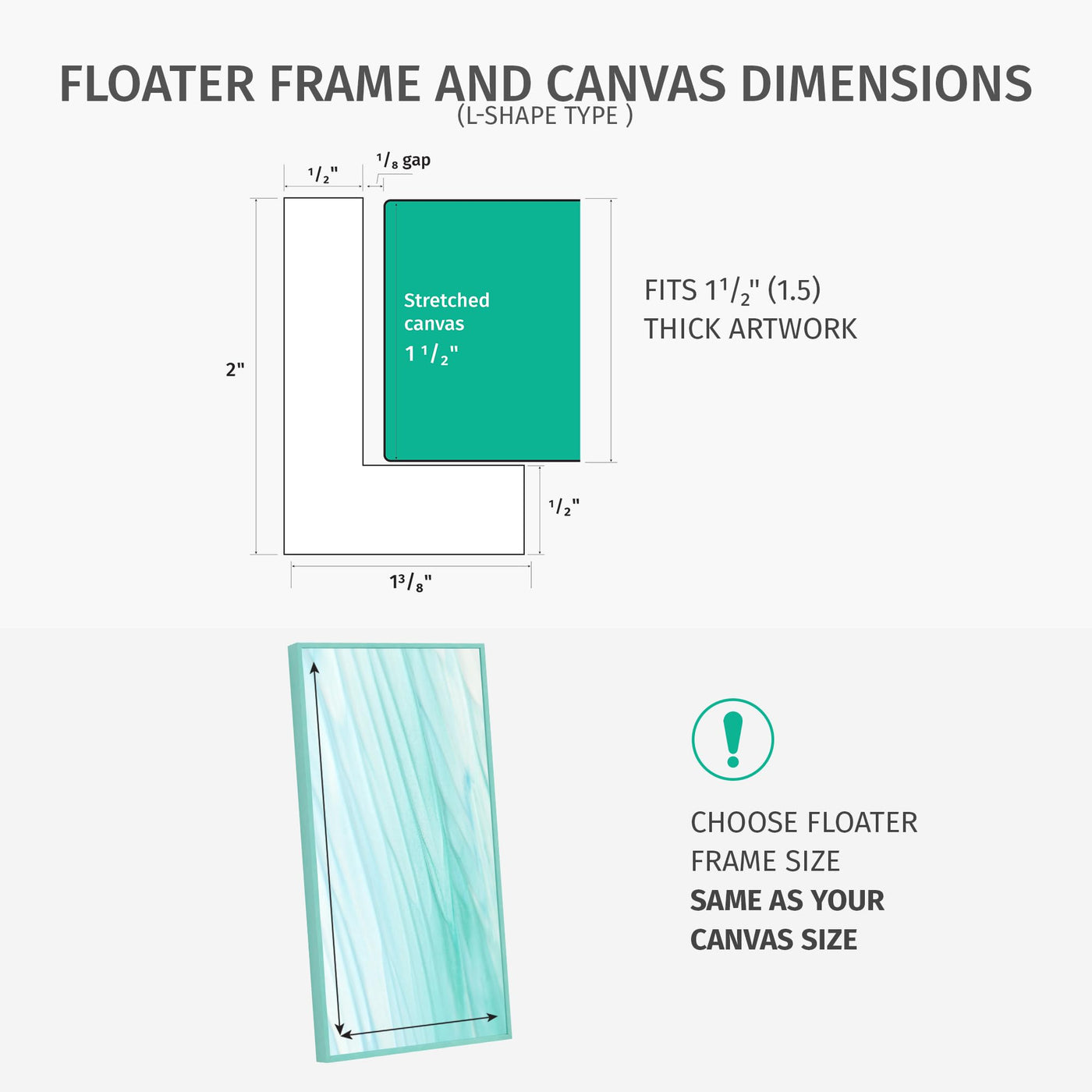 • Q: What is the thickness and gap of the floater frame? A: The frame thickness is 2 inches, and it is designed to maintain a minimum gap of 1/8 inch between the frame side-wall and your painting.
