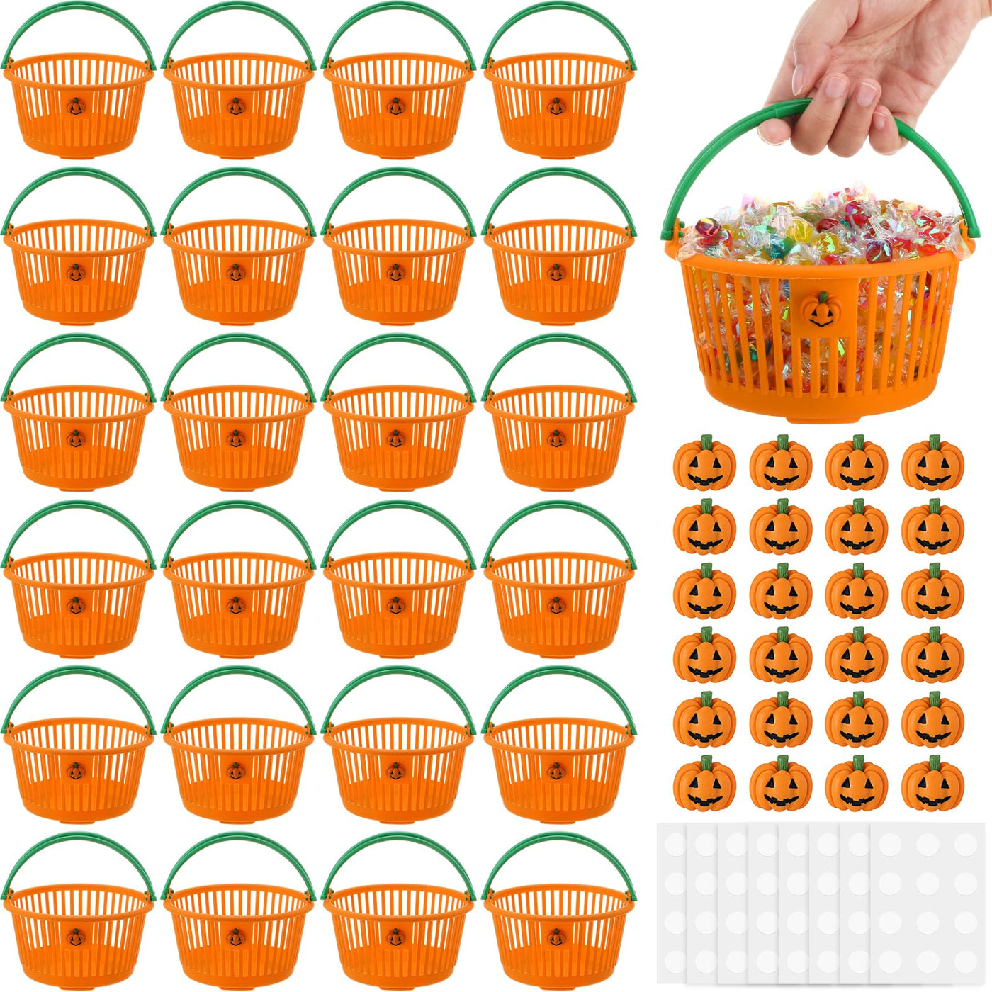 Potchen 24 Pcs Halloween Pumpkin Baskets Bulk Trick or Treat Candy Buckets Plastic Devil Smile Candy Basket with Handle Pumpkin