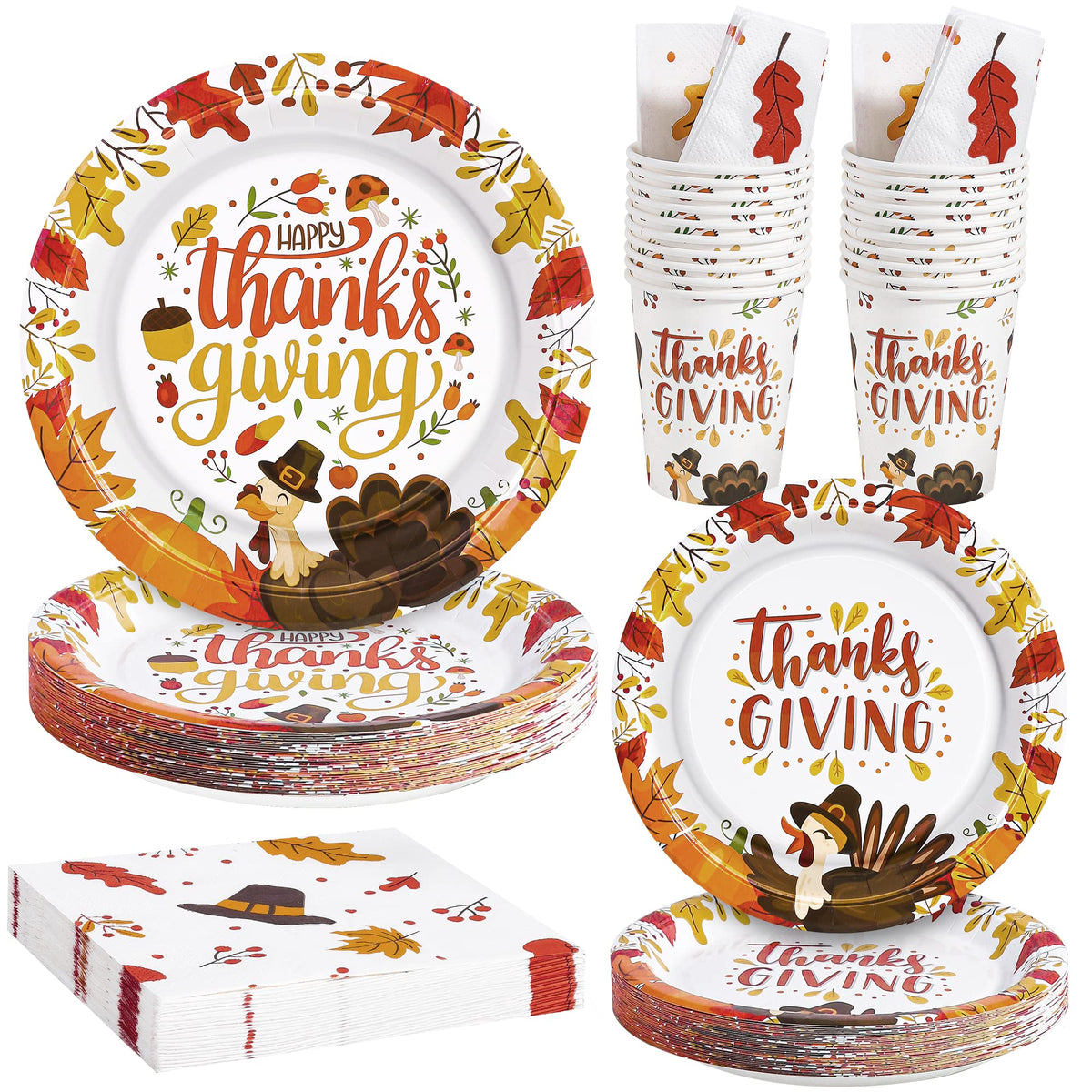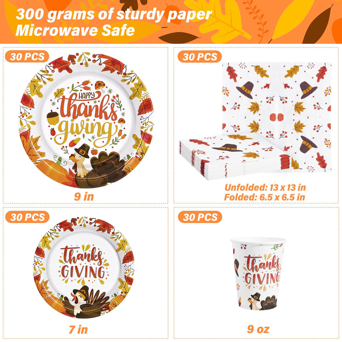 Why choose us? Saving your clean-up time Sturdy and microwave safe Create festive party atmosphere Creative design of tableware set Made of BPA-free food-grade paper Perfect Thanksgiving table decorations Autumn Theme Thanksgiving Party Plates and Cups Dinnerware Includes: 30 Pcs x 9'' Thanksgiving Dinner Plates 30 Pcs x 7'' Thanksgiving Dessert Plates 30 Pcs x 9oz Paper Cups These Thanksgiving decorations for table are perfect for Thanksgiving parties, feasts, banquets, autumn-themed birthday parties, harvest celebrations, or any autumn garden party event.