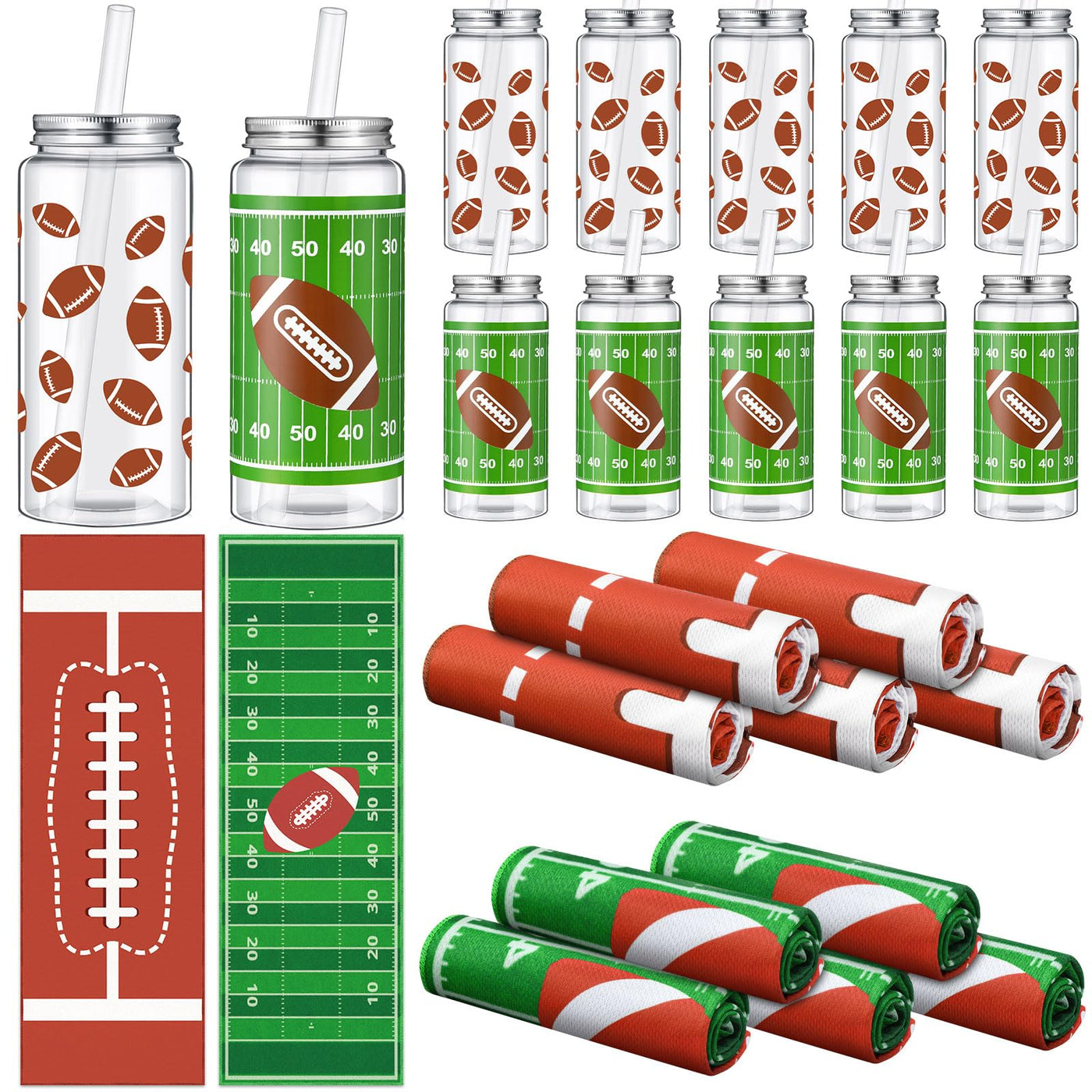 SmoothNovelty 24 Pcs 16.9 Oz Football Plastic Cups Bulk Football Cooling Towel Set Include 12 Footballs Theme Cups with Straw an