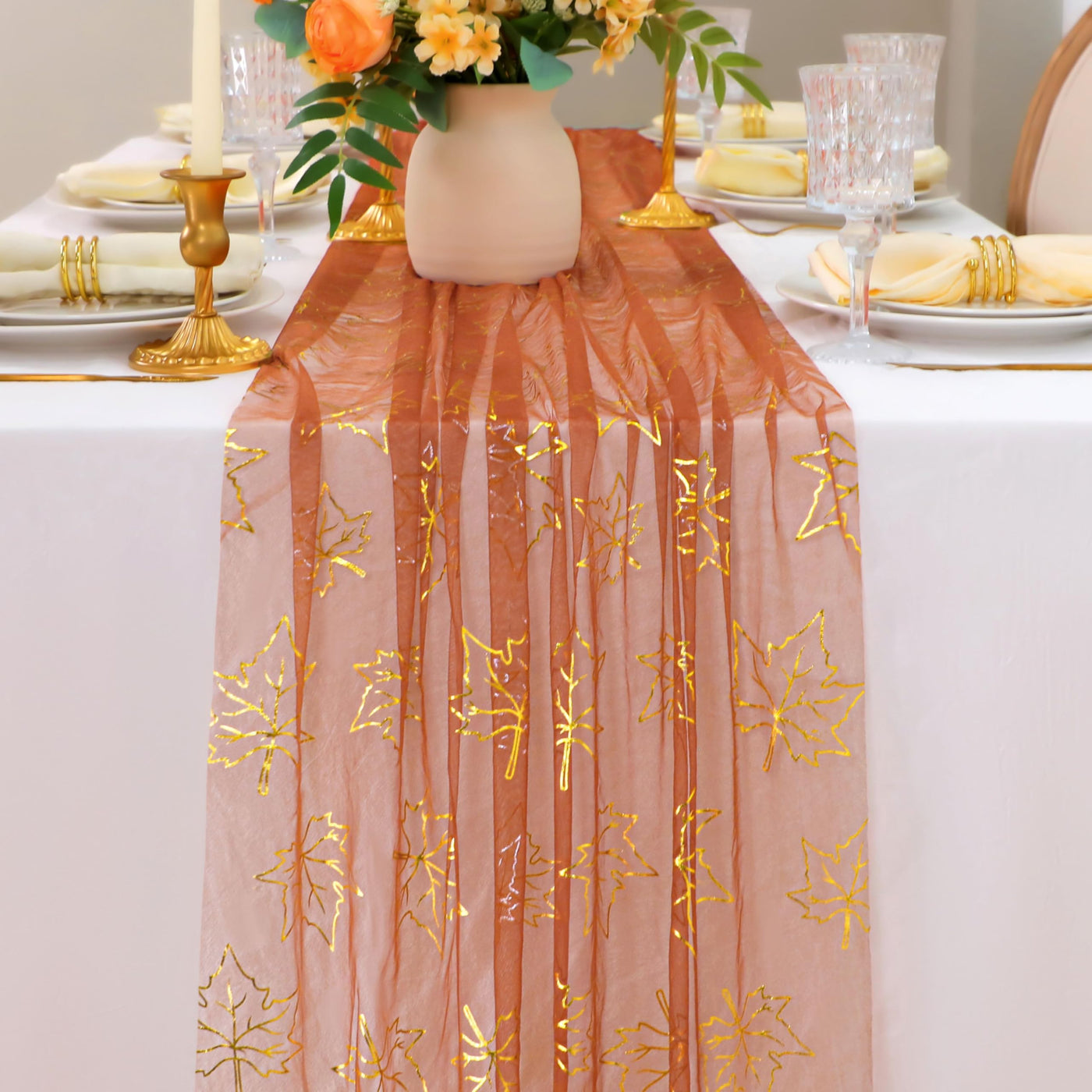 Snowkingdom Fall Thanksgiving Table Runner 10Ft, Gold Maple Leaves Burnt Orange Rust Sheer Tulle Gauze Cheesecloth, Golden Sequi