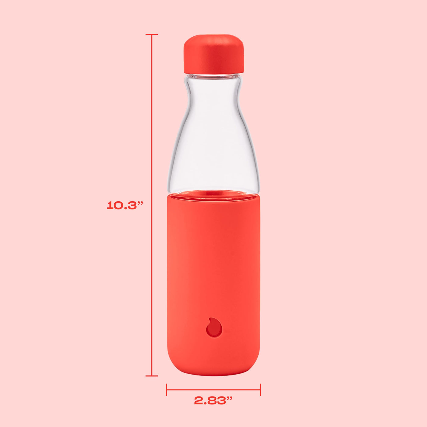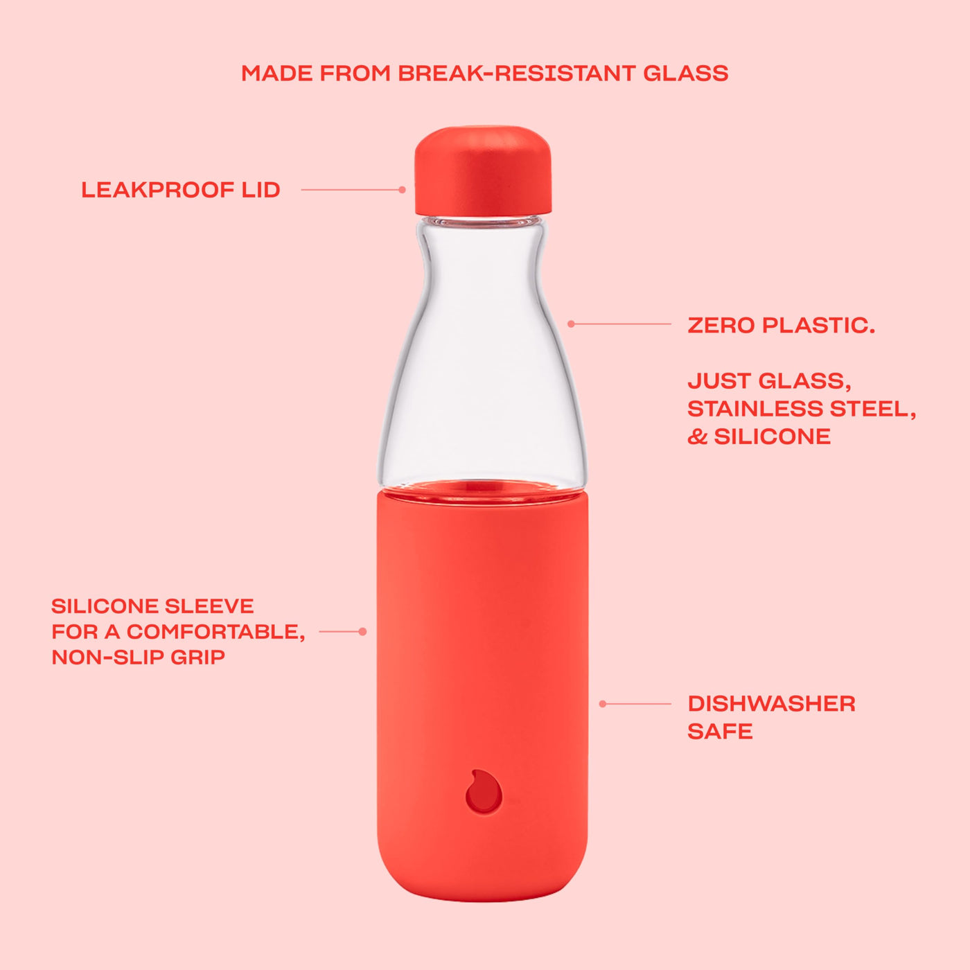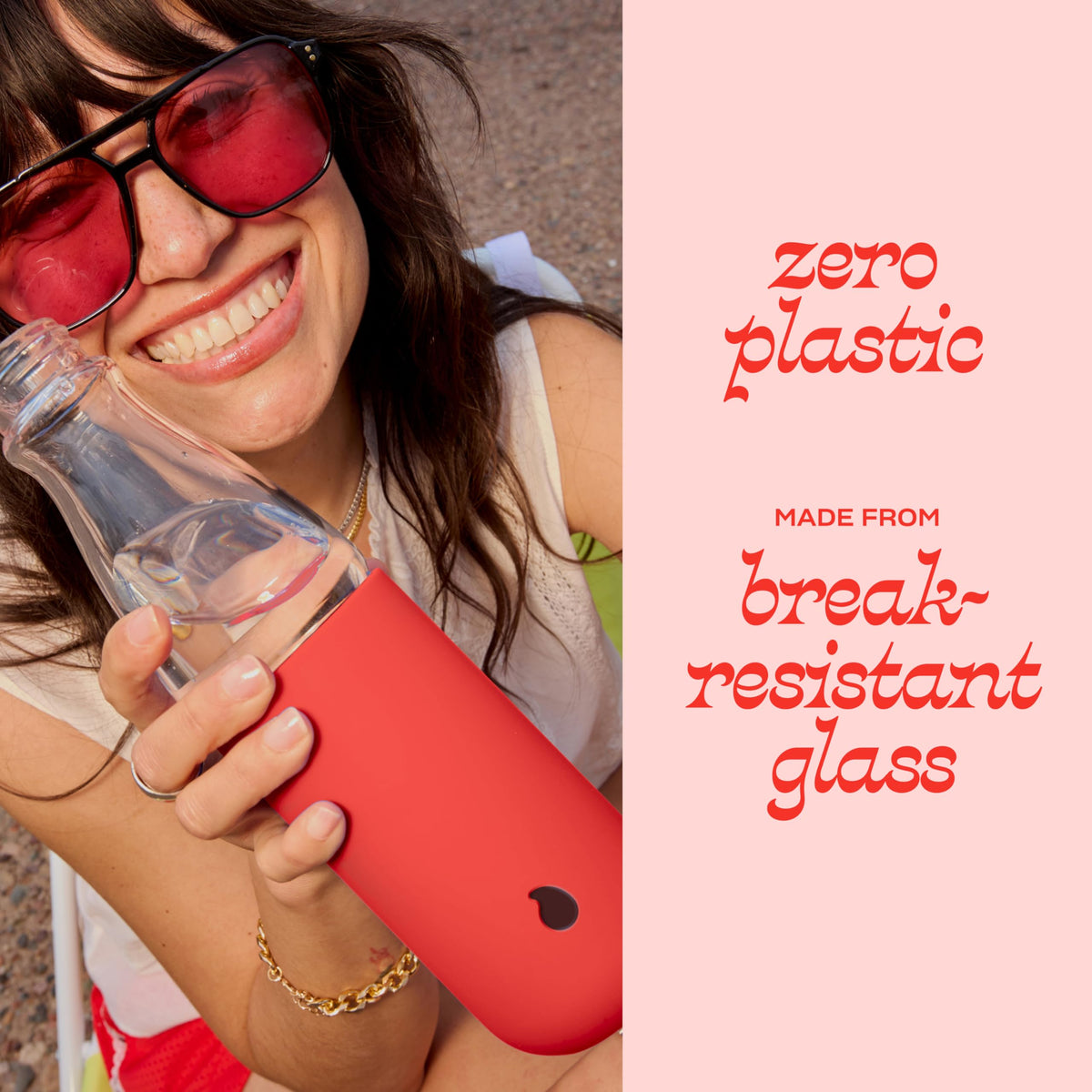 Pure glass. Zero plastic. Perfect taste. We took our iconic Original Bottle and reimagined it in glass for a perfectly pure taste, every time. Crafted from durable, break-resistant borosilicate glass, its designed to help preserve the pure taste of your drink with zero flavor transfer. Its also wrapped in a protective, food-grade silicone sleeve that adds a non-slip grip and a pop of color for extra style. A leakproof stainless steel lid with silicone gasket keeps your drink secure so you can toss it in your bag-whether heading to your commute, Pilates class, the park, or the farmers market-without worrying about spills or breaks along the way. The wide mouth fits most ice cubes for easy filling, and its cup holder-friendly shape makes it perfect for on-the-go hydration. BPA/BPS-free and made with zero plastic-just glass, stainless steel, and silicone-its both safe and sustainable. When its time to clean, simply pop the bottle in the dishwasher for effortless care or hand wash with warm, soapy water.