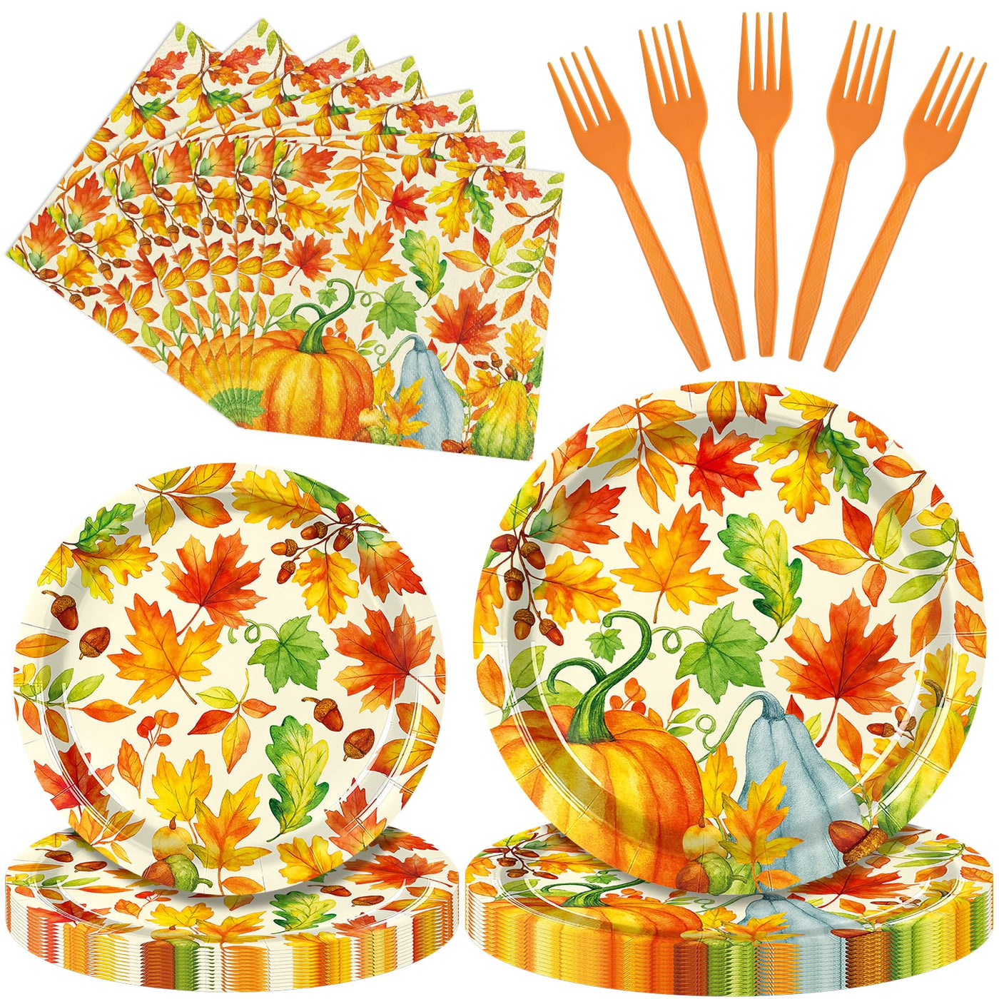 Temicle 96 Pieces Fall Thanksgiving Tableware Set - Pumpkin and Autumn Leaves Disposable Plates, Napkins, and Forks Party Suppli