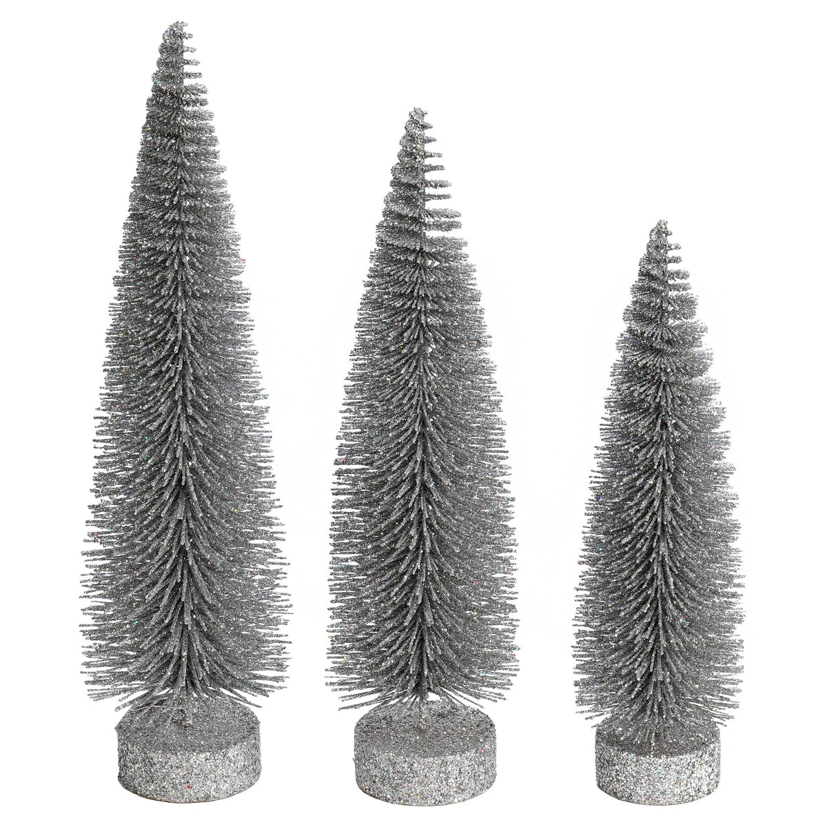 Vickerman 12-14-16 Silver Glitter Oval Pine Artificial Christmas Trees, Set of 3. A great addition to your holiday table d cor, this set of colorful trees includes three assorted sizes, they are glitter accented and come fixed in sturdy round bases. 12 Size: 3.25 L X 3.25 W X 12 H - 14 Size: 3.75L X 3.75W X 14H - 16 Size: 4L X 4W X 16H. For additional complimentary accents see the many wreaths and garlands available from Vickerman. This durable tree is maintenance free and will suit any decor. Vickerman has been an industry leader since 1940. Enjoy this expert designed seasonal tree around your home.