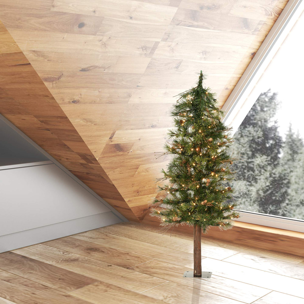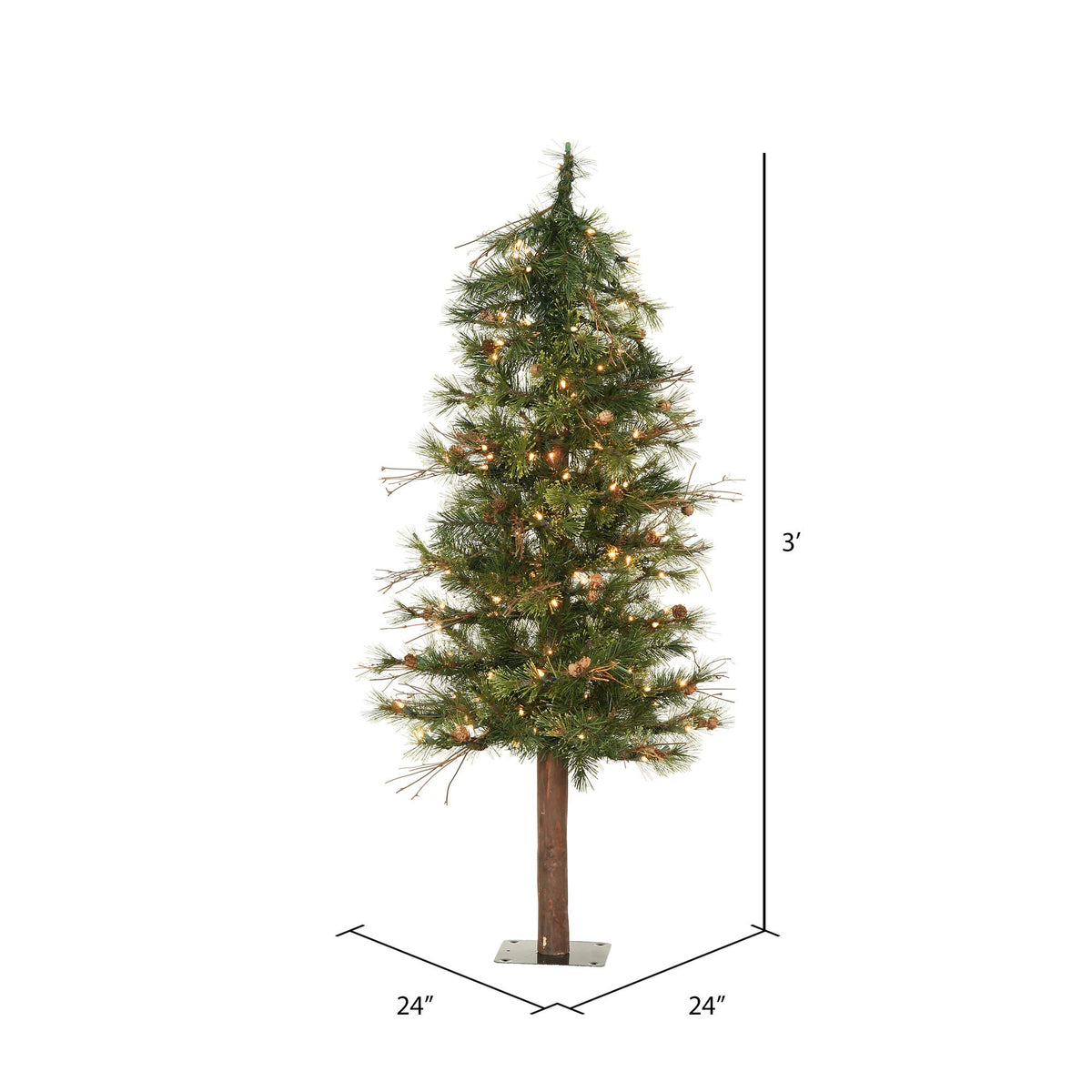 Vickerman 36 x 24 Mixed Country Alpine Artificial Christmas Tree featuring 145 PVC/Hardneedle tips and 70 Clear Dura-Lit Mini Lights. This incredible tree comes prelit with Dura-Lit Lights, it has a beautiful blend of PVC and Hardneedle tips with real pine cone and grapevine accents on a real wood trunk, a Flat Metal Tree Stand is Included. For additional complimentary accents see the many wreaths and garlands available from Vickerman. This durable tree is maintenance free and will suit any decor. Vickerman has been an industry leader since 1940. Enjoy this expert designed seasonal tree around your home.
