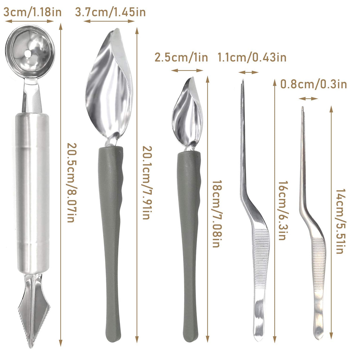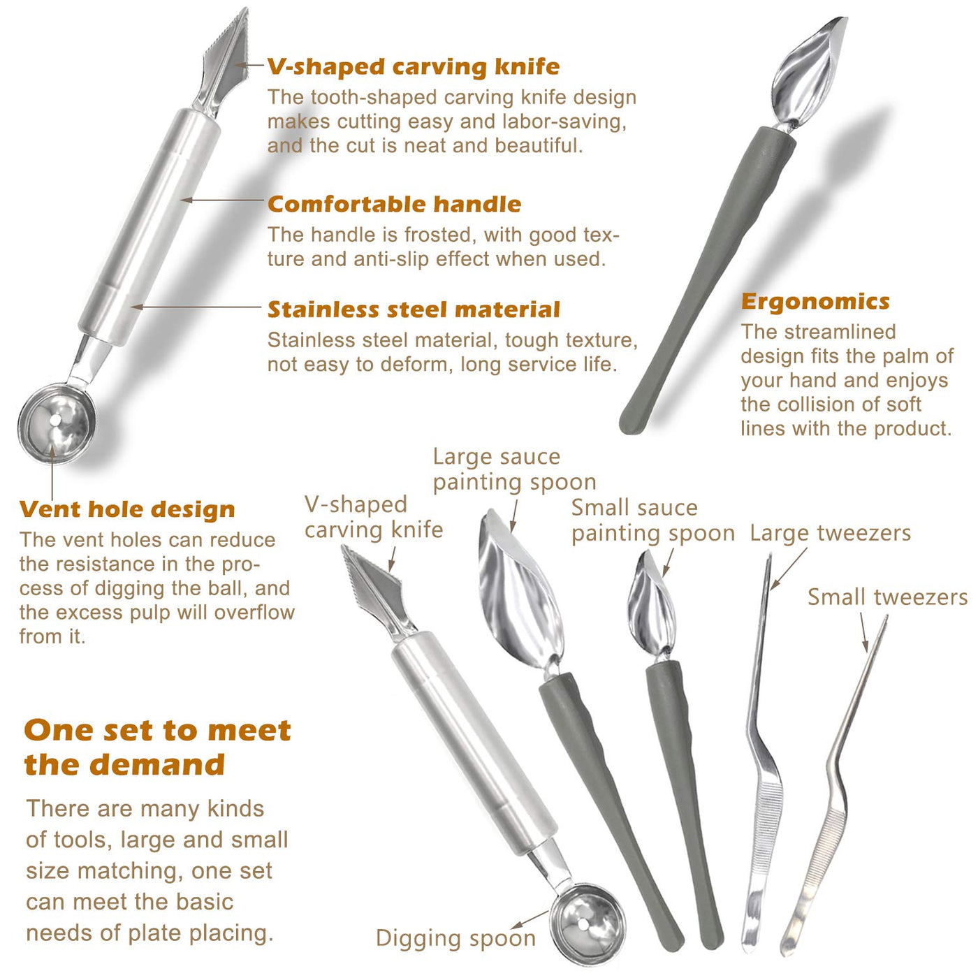 - Q: What is included in the 5 Pieces Culinary Drawing Decorating Spoon Set? A: The set includes two large and small decorative spoons, two large and small cooking tweezers, and a double-headed fruit baller scoop.